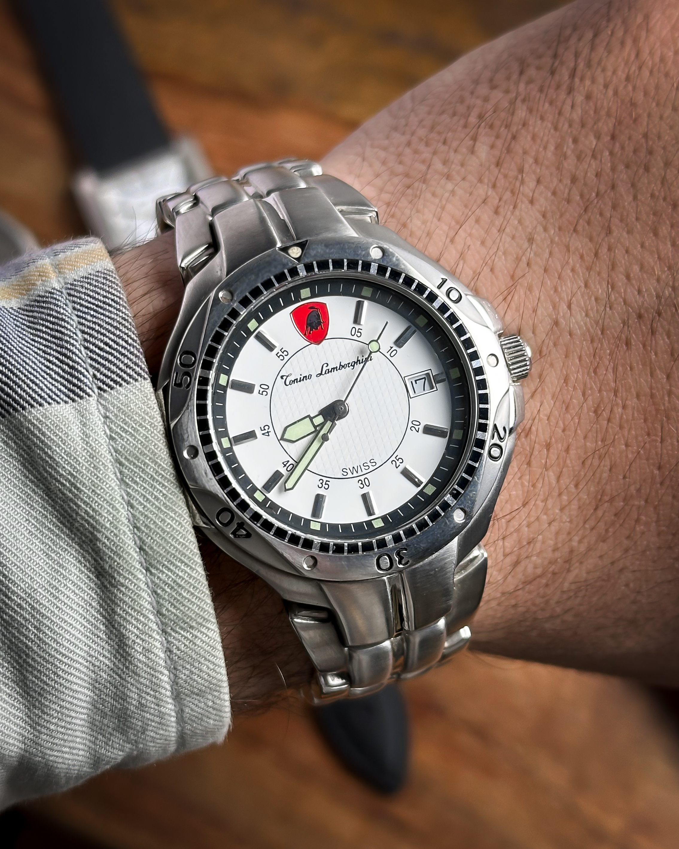 [Timestamp](https://drive.google.com/file/d/1qD6-V1t6AecoBnbRQpQSDA9JTynzcy51/view?usp=sharing) Up for sale is a bold, high-performanceย **Tonino Lamborghini**ย sports watch. This isn't just a fashion piece; it is a serious Swiss-made tool watch that reflects the mechanical heritage of its namesake. The dial is full of depth, featuring aย **dashed lining pattern**ย in the center circle, surrounded by an outer ring with slanted baton indices. Theย **inner bezel**ย adds a technical layer with minu...