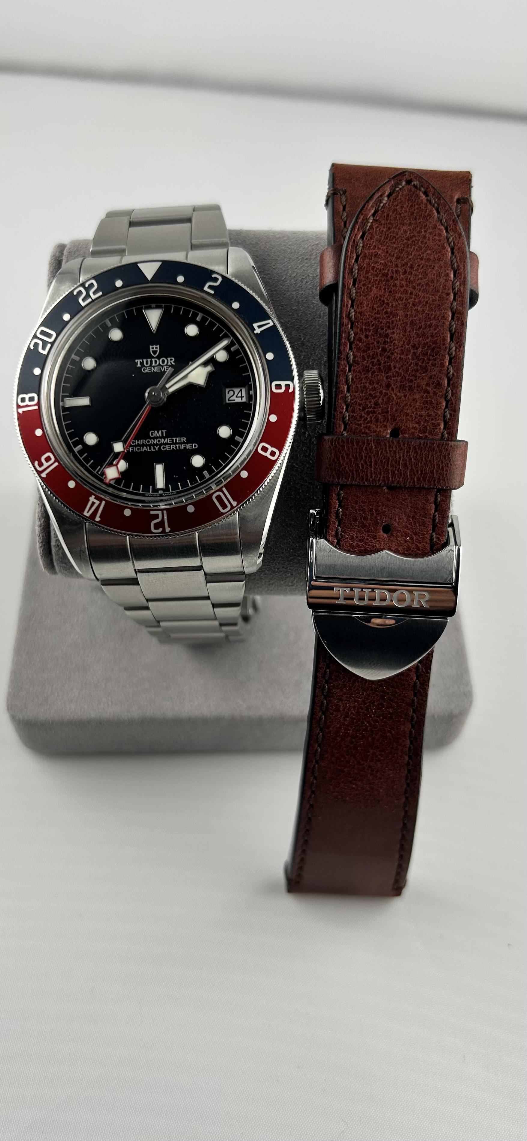Why beg an AD, build a purchase history, and lose your dignity when you can just buy the watch that actually wants to be worn? Tudor Black Bay GMT Pepsi on a Forstner bracelet (because comfort matters) and includes the OEM Tudor leather strap, full box, card, manuals, and the whole kit. Pepsi bezel, true GMT function, in-house movement, date, and enough presence to make your other watches nervous. Great condition with normal honest wear. Looks sharp on wrist and comes ready for immediate trav...