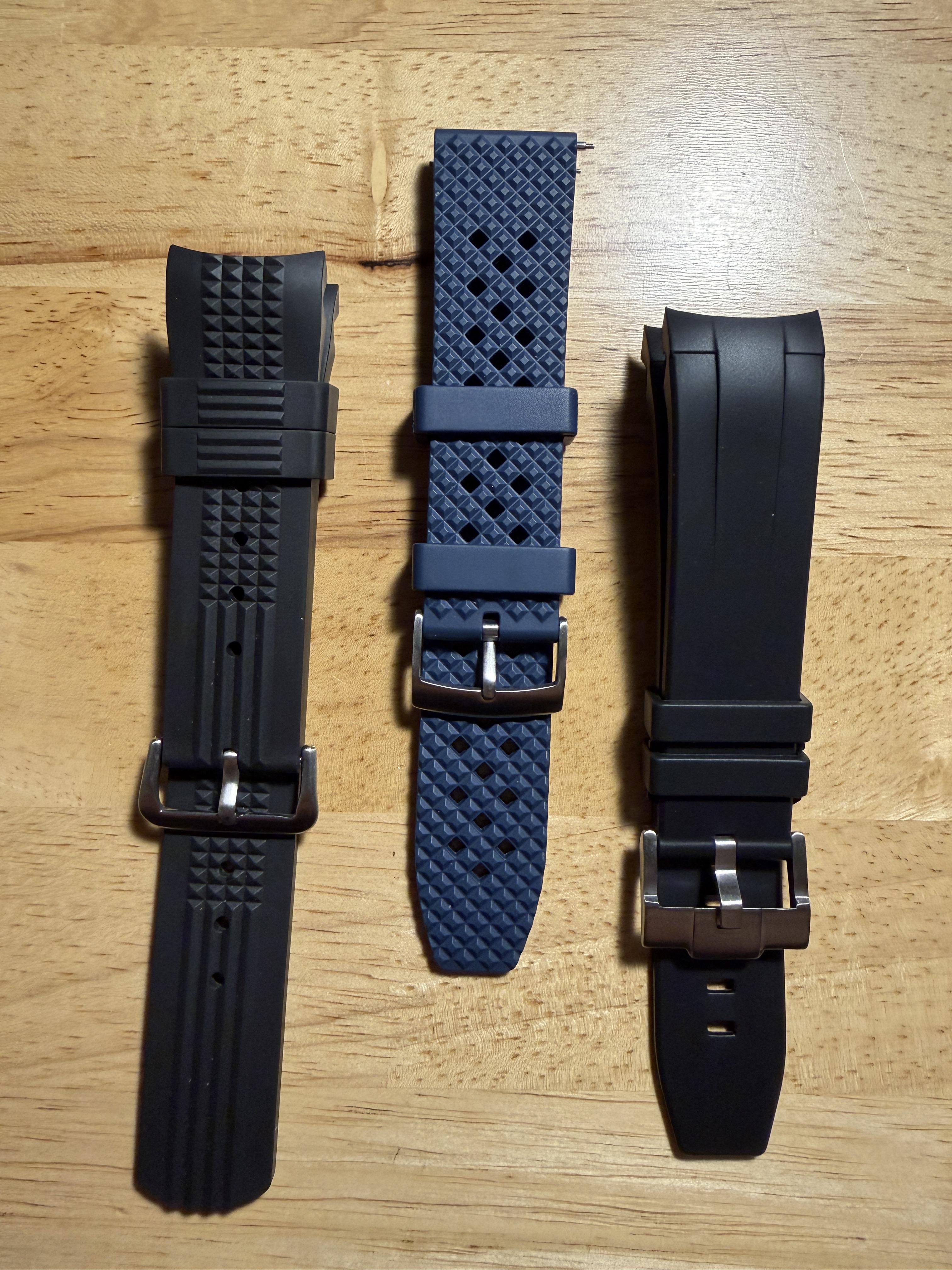 For Sale - $50 Shipped for all 3 1 - Monstrap 22mm curved end link fitted black strap - $58 retail https://monstraps.com/collections/for-seiko/products/copy-of-fkm-rubber-skx-srpd-black-rose-gold-hardware 1 - Islander curved end link fitted black black waffle strap - $45 retail https://monstraps.com/collections/for-seiko/products/copy-of-fkm-rubber-skx-srpd-black-rose-gold-hardware 1 - Unbranded high quality FKM waffle straight end blue