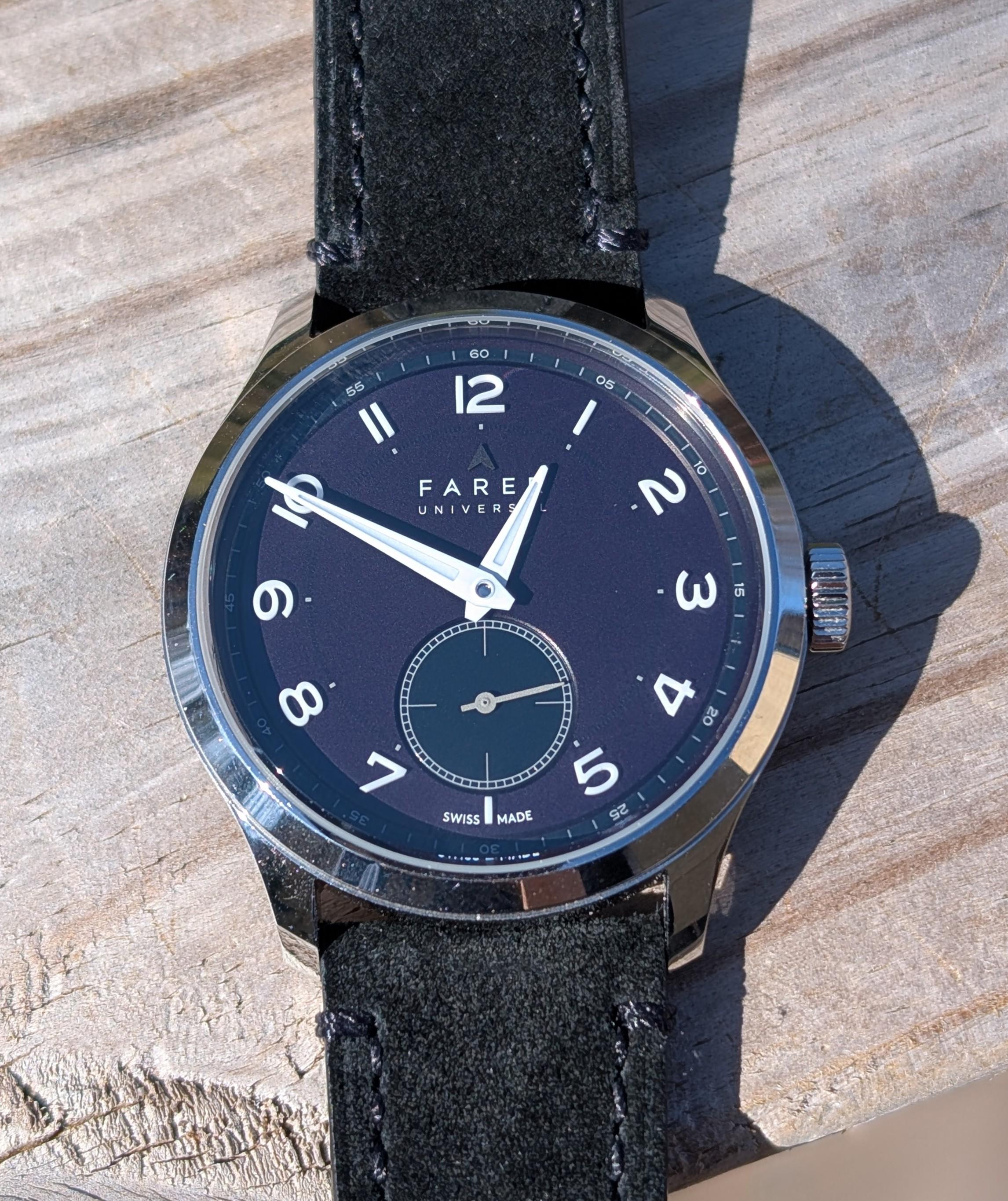 For sale is my Farer Lissom Solander. I purchased this watch new directly from Farer in January of 2026, so a catch and release here. I like the watch, but I don't love it, so it's going to move on. The Solander is a slim, 38mm watch with a sub-seconds dial at the 6 o'clock position. The Arabic numeral indices are solid blocks of Lumicast, a blend of Grade X3 Super-LumiNova and ceramic. The dark black dial has a purple-ish hue in bright, direct light. It has a polished bezel surrounding a flat ...