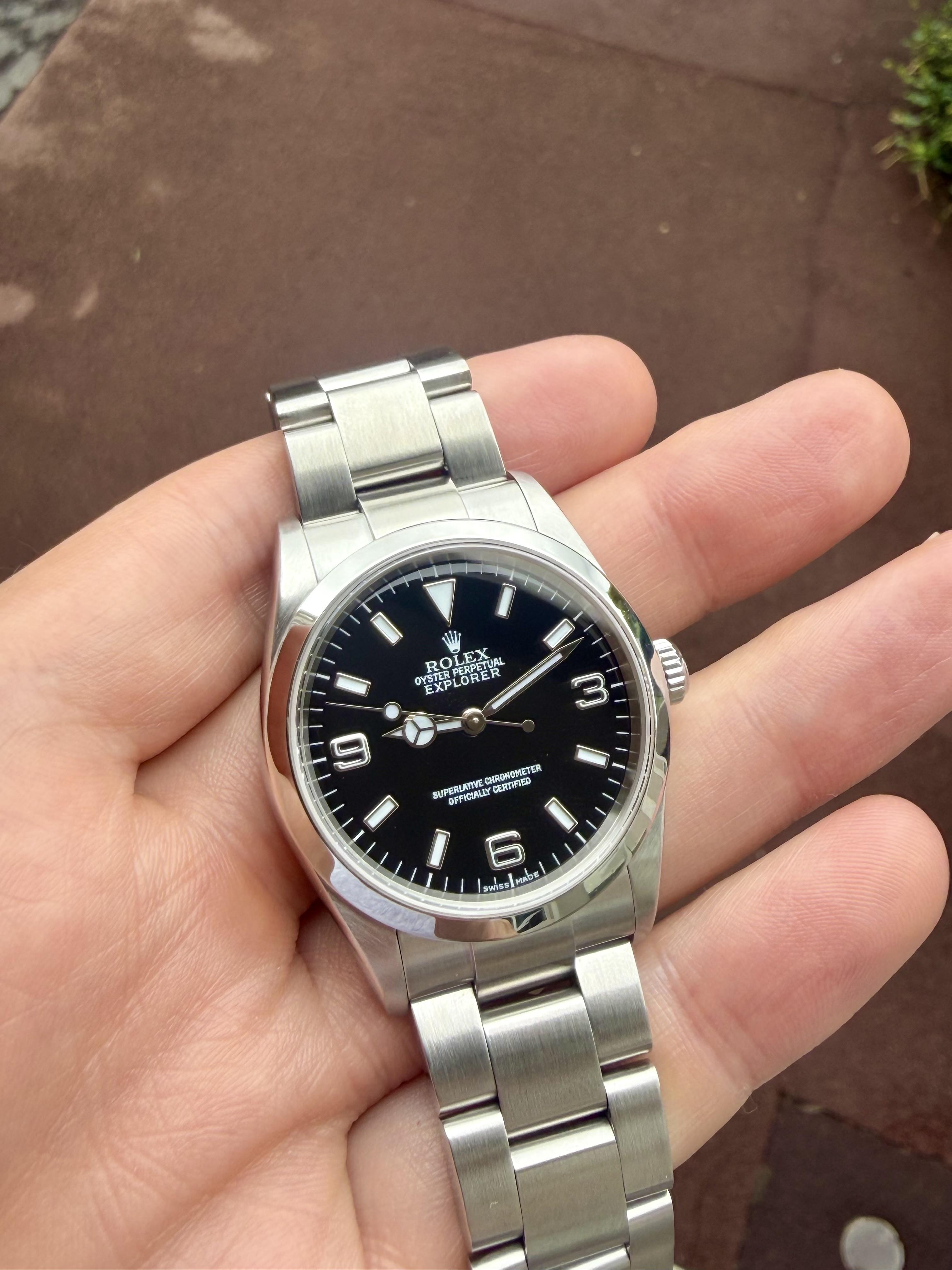 Up for grabs to today is this very nice **Rolex Explorer** (ref. 114270), which comes with box and papers from 2003. To me, the 36mm Explorer is the perfect version of this watch, with the classic design sitting elegantly on the wrist. The proportions are perfect, and the watch can be dressed down for a Sporty look, or dressed up with formal attire. This example comes as a full set with the inner + outer box, papers, original hang tag and booklets. The watch is in excellent condition, with cl...