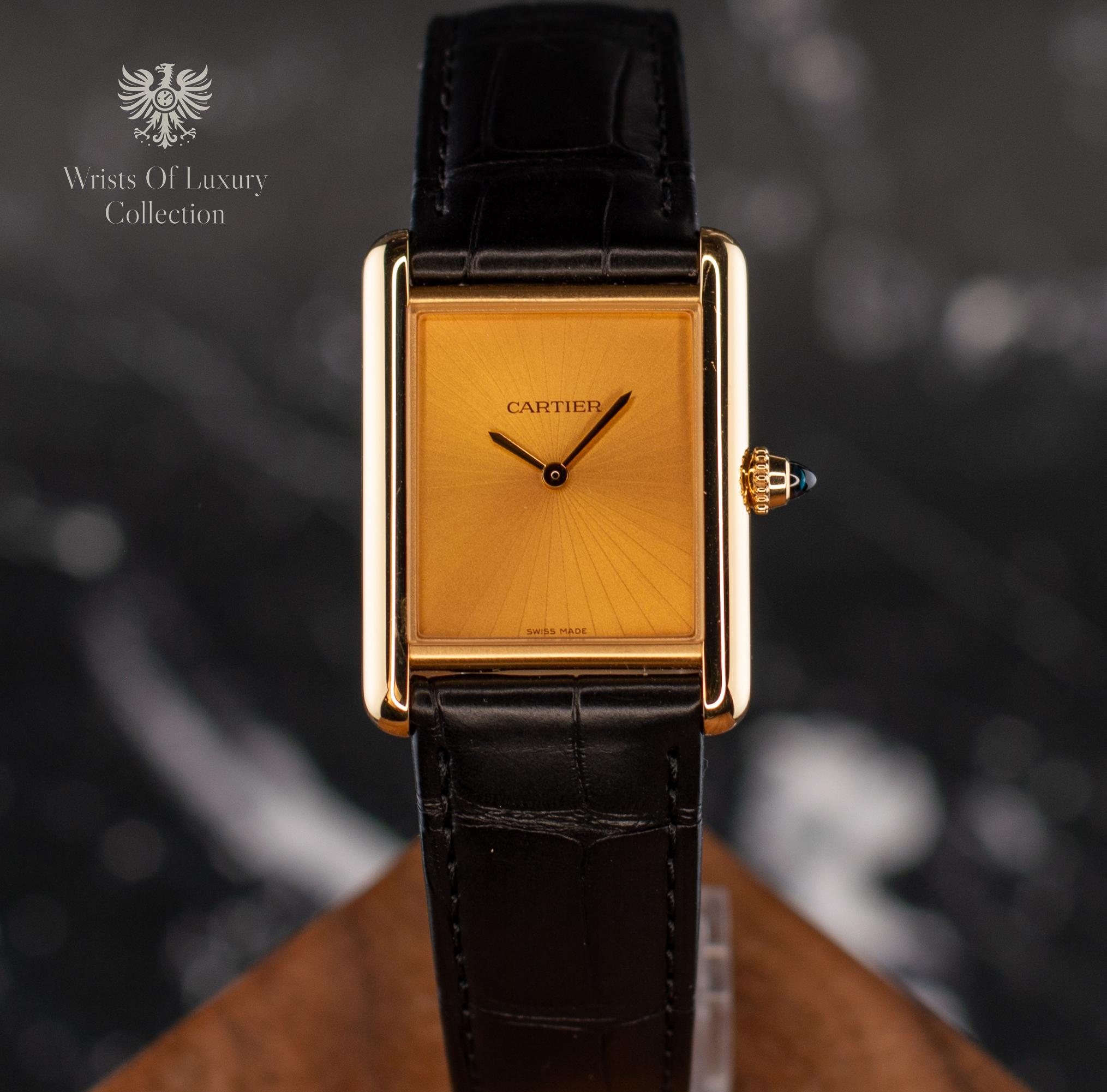 Available today from the Wrists of Luxury Collection s probably one of the least know Cartier Tank models available currently, and it's quite unfortunate considering it is an absolute stunning timepiece. Crafted with an all gold aesthetic, textures and sheens providing any contrast. The solid 18k gold polished cased, angular sword shaped gold finished steel hands, and a beautiful gold segmented sunburst dial. The dial is definitely the show stopper here, truly exceptional and one of those you ne...