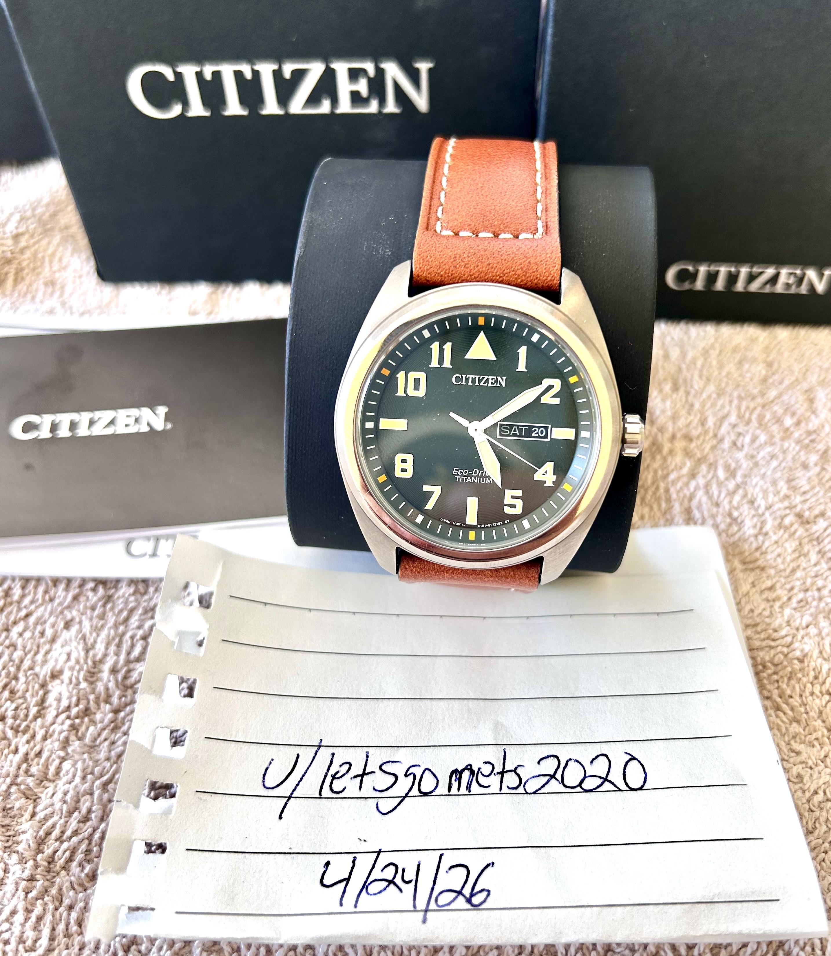 Citizen Garrison Titanium field watch. Great color palette with green dial, yellow indices, white second hand, and white/orange sub-indices. It also has a day date window. Comes with a caramel brown leather strap with white stitching. It runs on Citizen’s Eco-Drive technology, which makes it an excellent grab and go watch that runs for months. 100m WR and sapphire crystal. I bought it new in April 2025 and it remains in excellent condition. Slight tear on the outer box, but the display box it c...