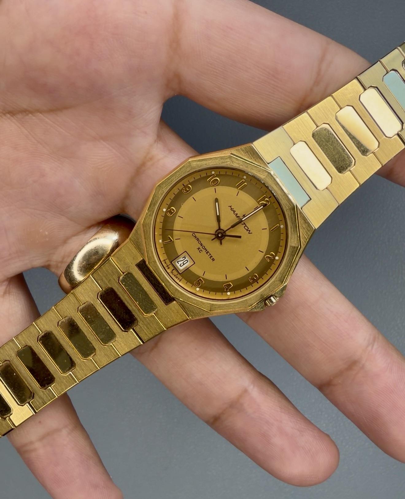 Hamilton Chronometer XC -Details: An absolutely beautiful Men’s Hamilton Chronometer XC in gold! Watch only. This neo-vintage piece is reminiscent of the VC 222 with its bracelet and thin case! Photos and video do not do this piece justice! Perfect for any person looking for something unique and special to add to their collection! -$247 shipped -Includes shipping (US). I accept Venmo, Zelle, CashApp, and PayPal (+4% if using G&S) -Case size: 33mm -Movement: Quartz -Timestamp: https://imgur...