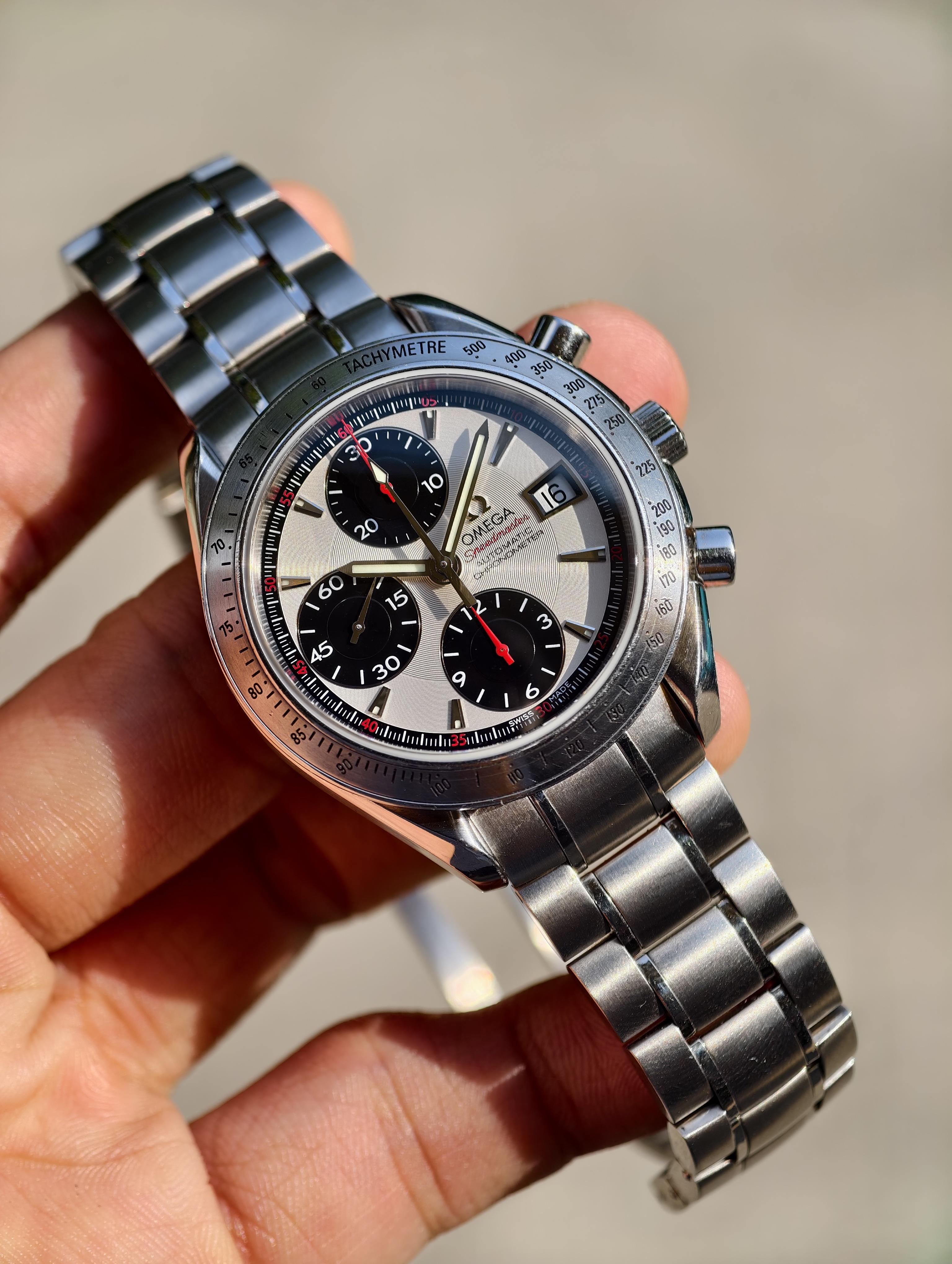 Up for sale is an Omega Speedmaster Date ref. 3211.31.00 featuring a clean silver “panda” dial with black subdials and subtle red accents. The dial shows a nice concentric texture that shifts under light, paired with applied indices and a well-balanced layout with the date at 3 The stainless steel case measures 40mm with approximately 46mm lug-to-lug, ~15mm thickness, and 19mm lug width. The case is unpolished, retaining its original factory lines with honest wear. A key highlight on this refer...