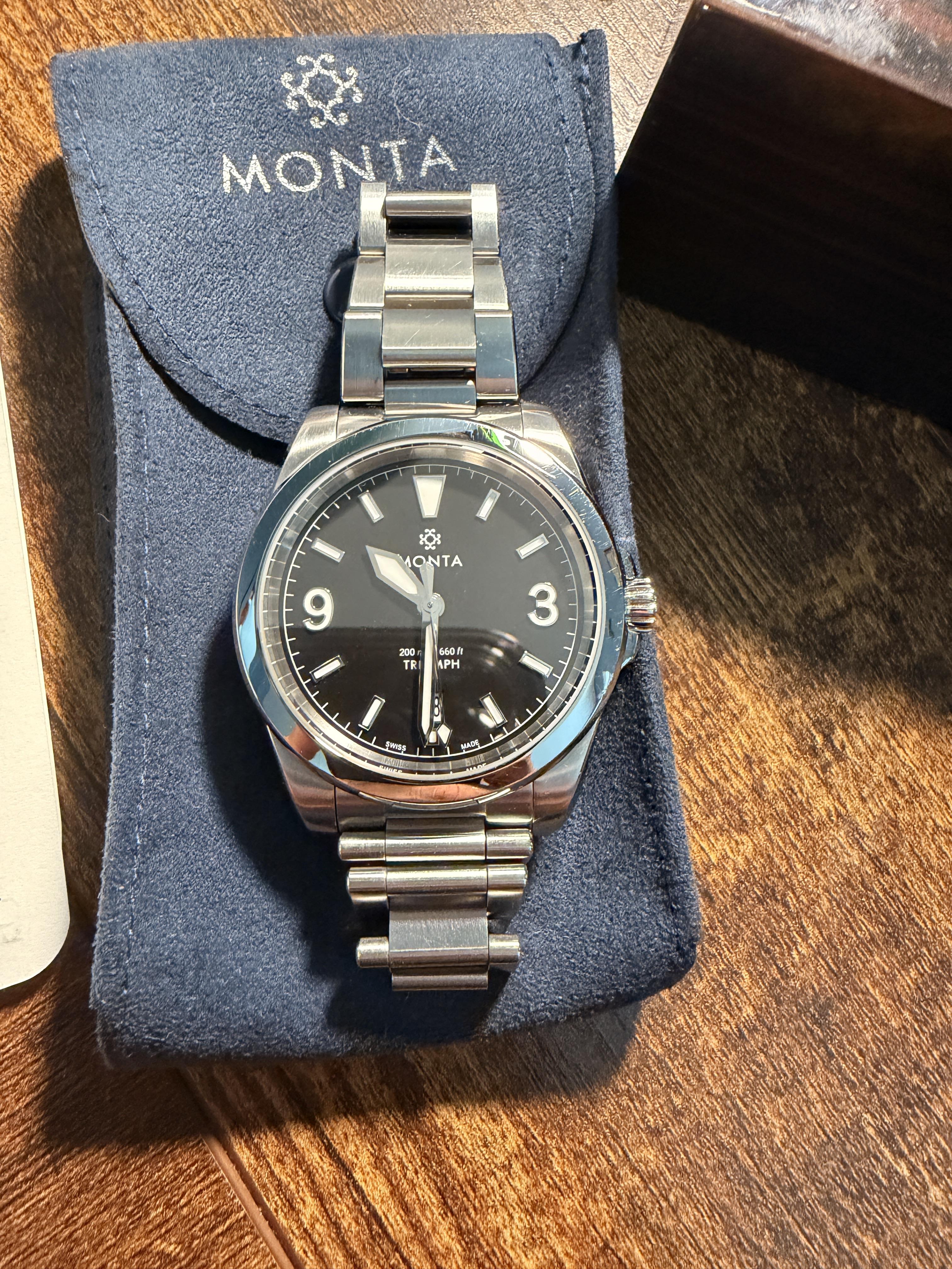 Selling my Monta Triumph V2 in excellent condition. If you’ve handled Monta before, you already know the finishing and bracelet quality are a cut above most in this range. This is a super clean, versatile piece that easily fills that Explorer-style daily role without the price tag. 39mm case wears extremely well with a slim profile and great proportions. Bracelet is a standout with excellent taper and comfort. Running strong and keeping accurate time. Case and bracelet show light wear from nor...