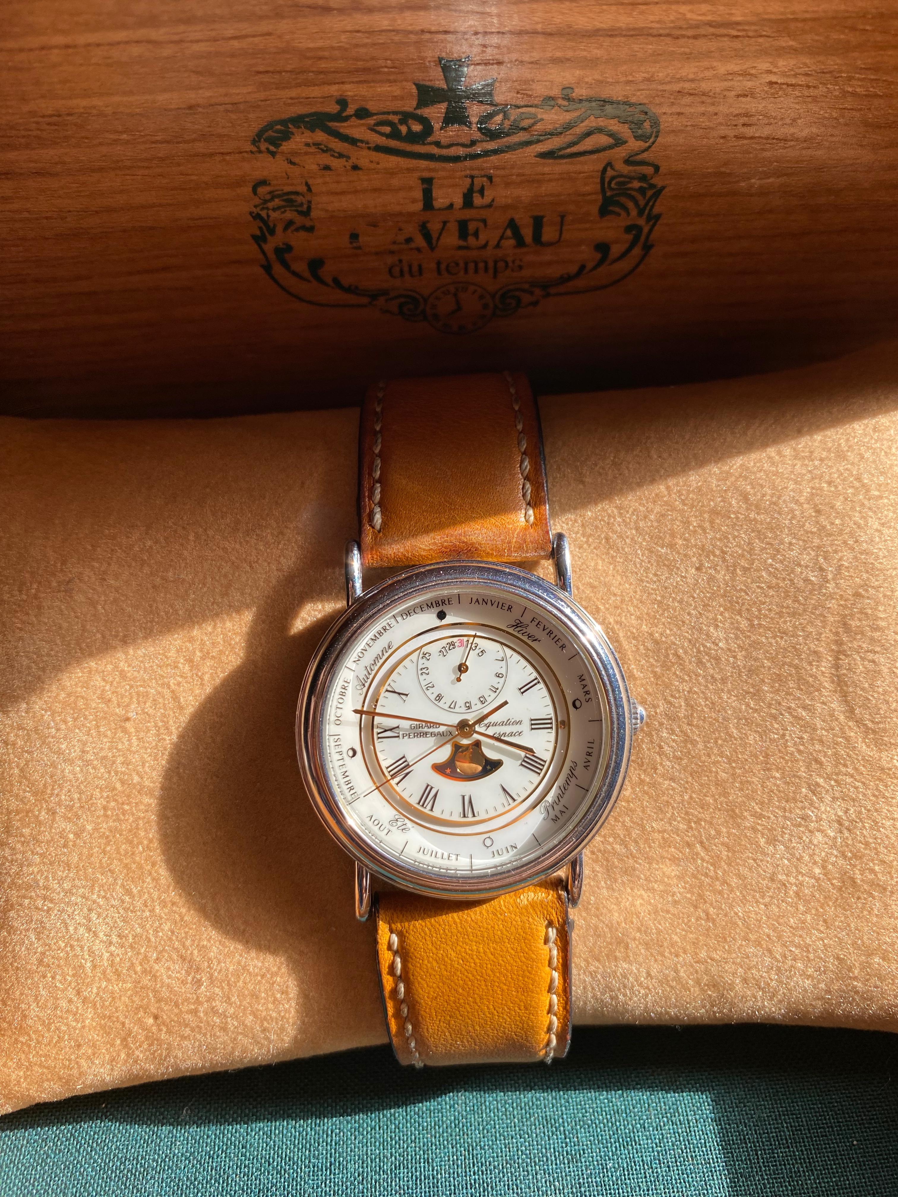 [Timestamp](https://postimg.cc/qgbCDB91) Offered for sale is a collector's example of the famous "Equation Espace" complication by Girard-Perregaux. Originally sold at the prestigious Le Caveau du Temps / Plinio Gioielli boutique in Milan, Italy. This is a true "Time Capsule" set in impeccable condition. Original full set including the rare premium wooden box signed "Le Caveau du Temps," green velvet travel pouch, original stamped warranty (12/15/2000), and the original fiscal boutique receip...