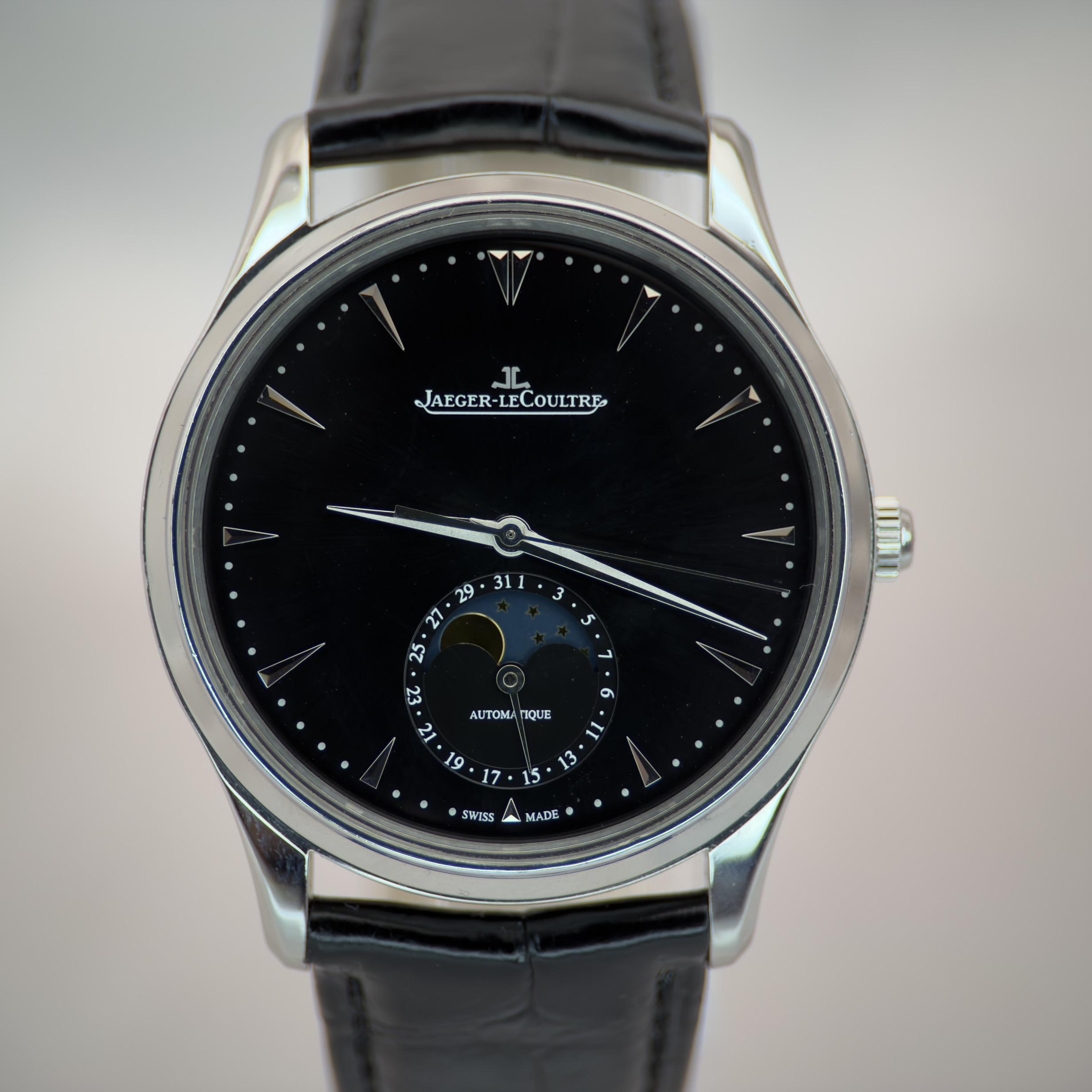 Jaeger-LeCoultre Master Ultra Thin Moon 39 Ref. Q1368470 | Box & Papers Price: 6750 + ship Offered here is the elegant and highly versatile Jaeger-LeCoultre Master Ultra Thin Moon 39 in stainless steel — one of the most refined modern dress watches in the brand’s lineup. Key Highlights: • 39mm case (~9.9mm thin) — ideal proportions, wears effortlessly • Sunburst black dial with applied indices & dauphine hands • Moonphase with date at 6 o’clock — clean, balanced layout • In-house automat...