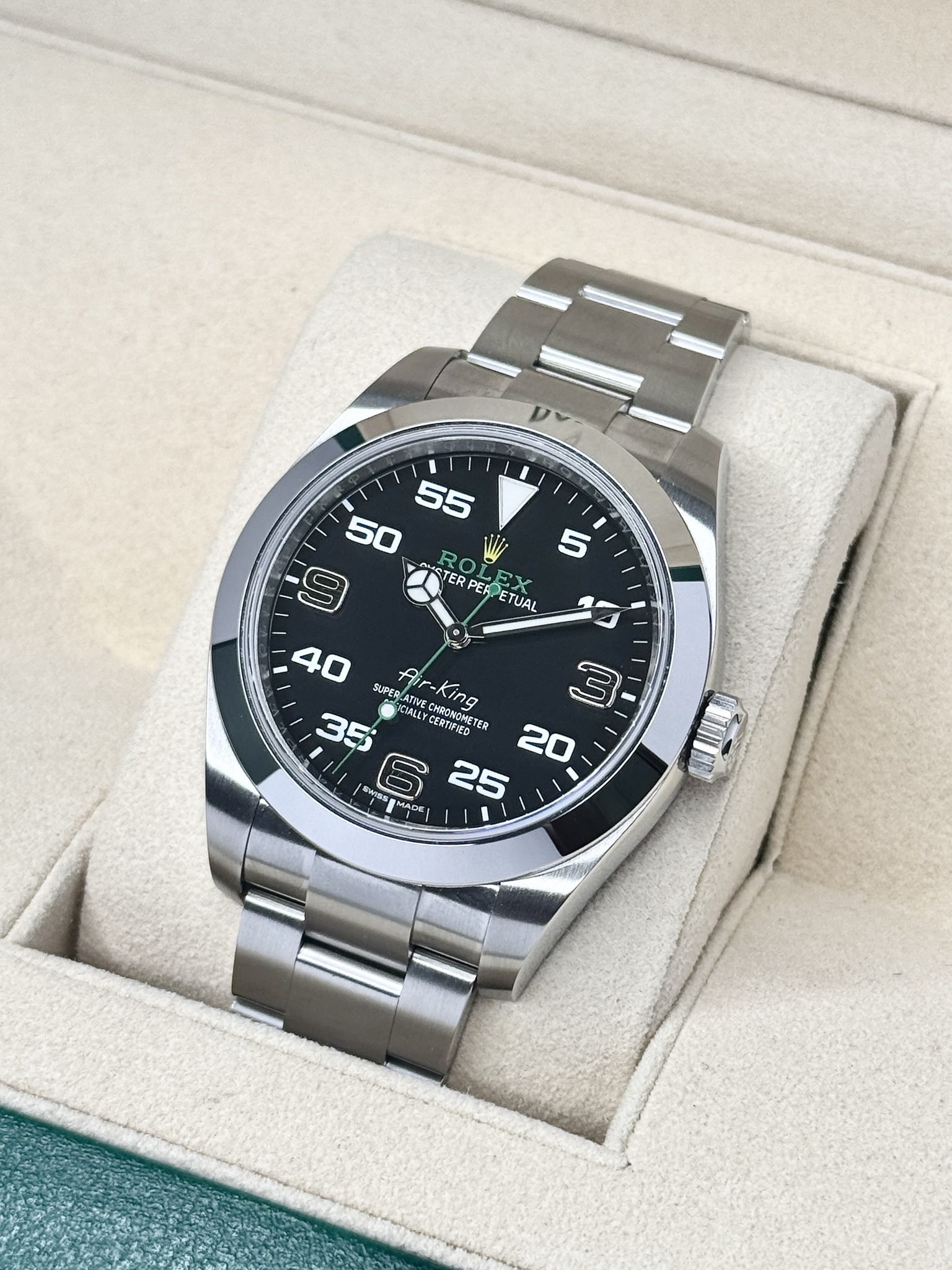 View more about Rolex Air-King 40 — Black Dial, Green/Yellow Accents and similar referencesWristViewSee this watch model on your wrist