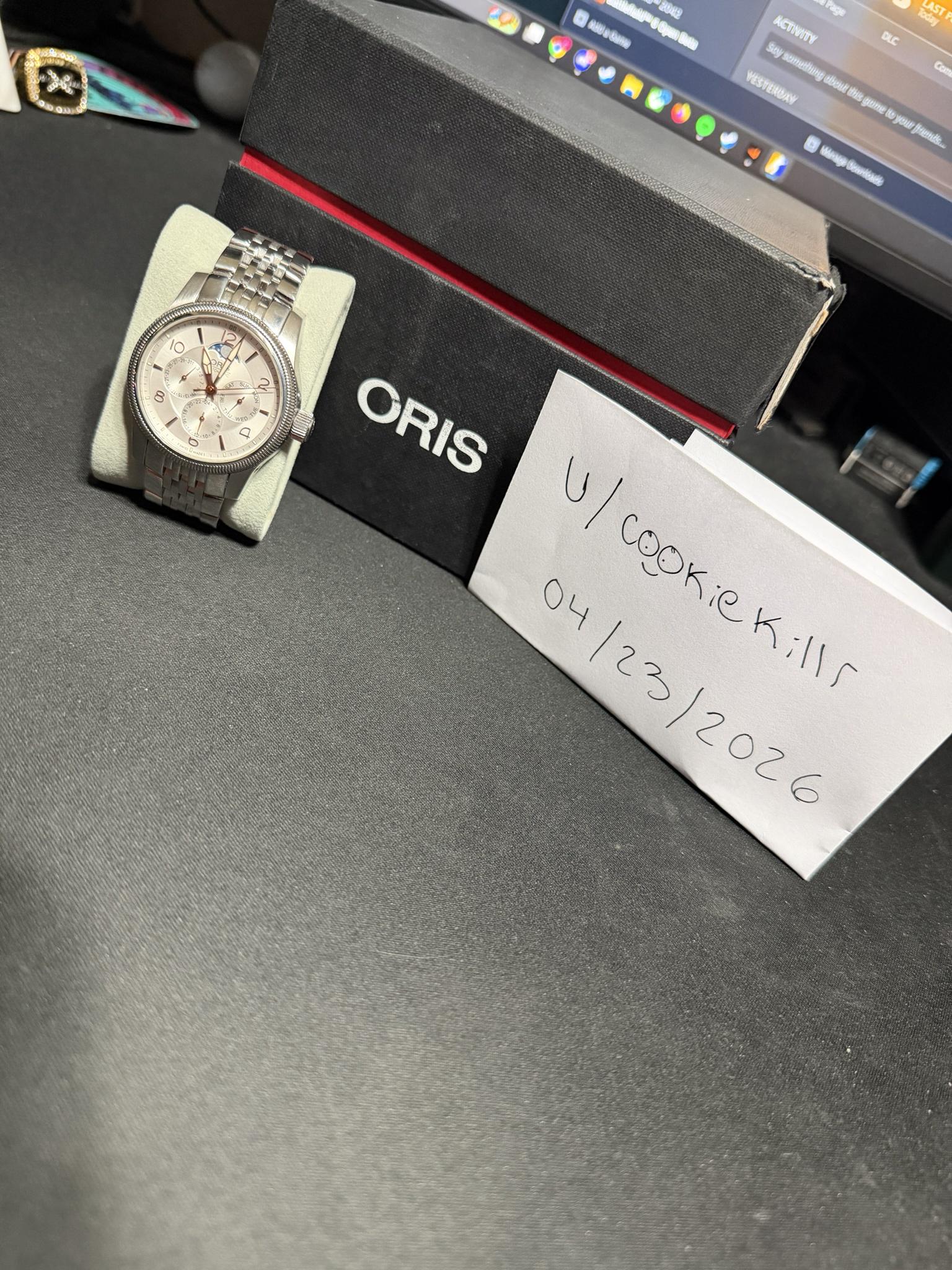 Hey yall. I am wanting to sell my Oris Moonphase. I recently purchased from u/[AudaciousCo](https://www.reddit.com/user/AudaciousCo/) . Obviously, I can't take as great of photos or videos as him. However, the watch is in perfect condition. I am selling because the 40mm is too big for my teenie weenie wrist. Asking what I paid for it $1170 Shipped CONUS. Please reach out if you have any questions :) [TIMESTAMP/PHOTOS](https://imgur.com/a/oris-moonphase-bcoi6aW)