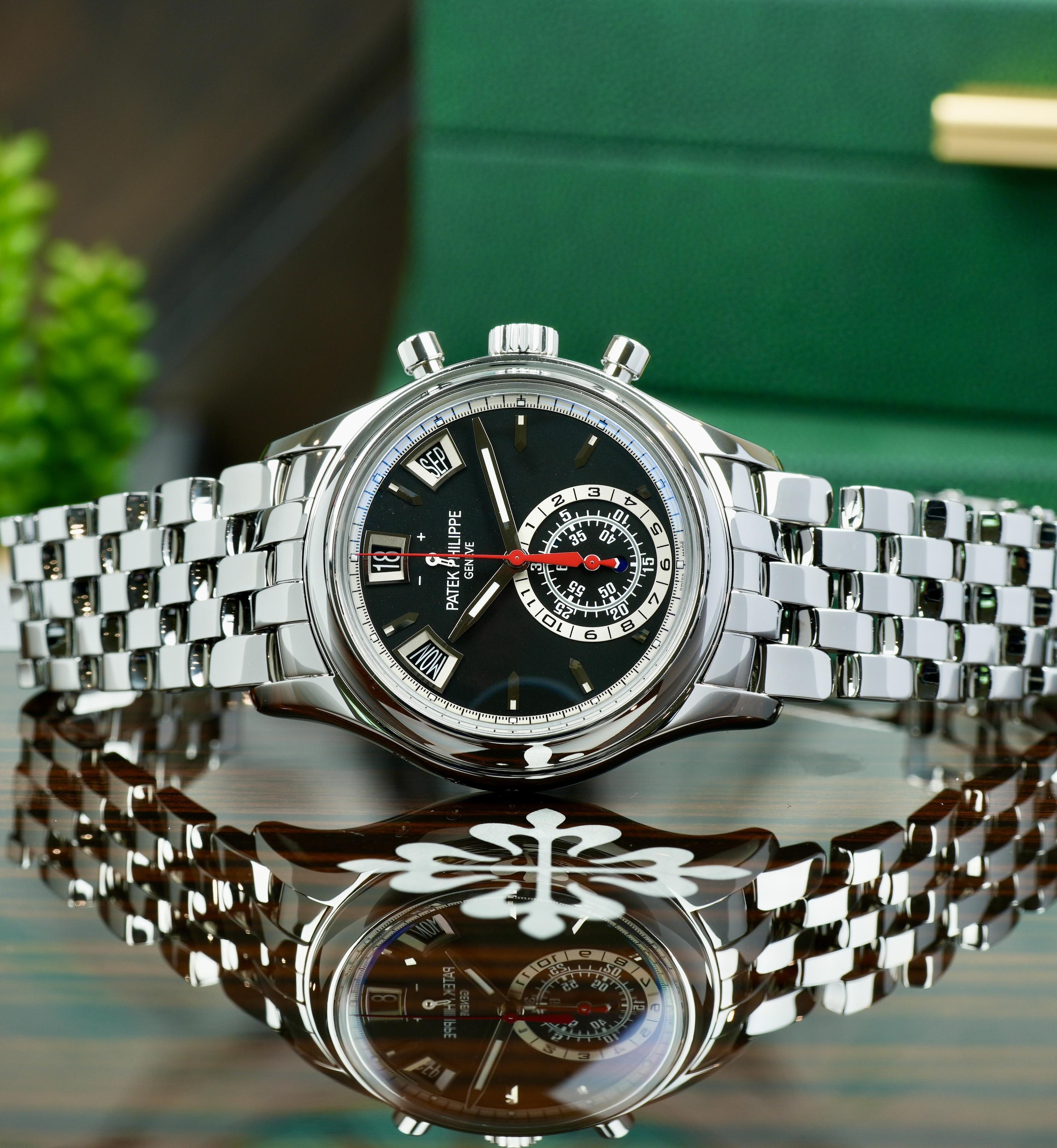 2018 Patek Philippe 5960/1A-010 Annual Calendar Chronograph Complete Set Timestamp: [https://imgur.com/1TgK6f5](https://imgur.com/1TgK6f5) A standout in Patek Philippe’s lineup, the Patek Philippe Annual Calendar Chronograph 5960/1A-010 is a rare fusion of high complication and modern sportiness. Crafted entirely in stainless steel, this model marks one of Patek’s few ventures into complicated steel watches—making it especially sought after by collectors. The 40.5mm polished case and ...