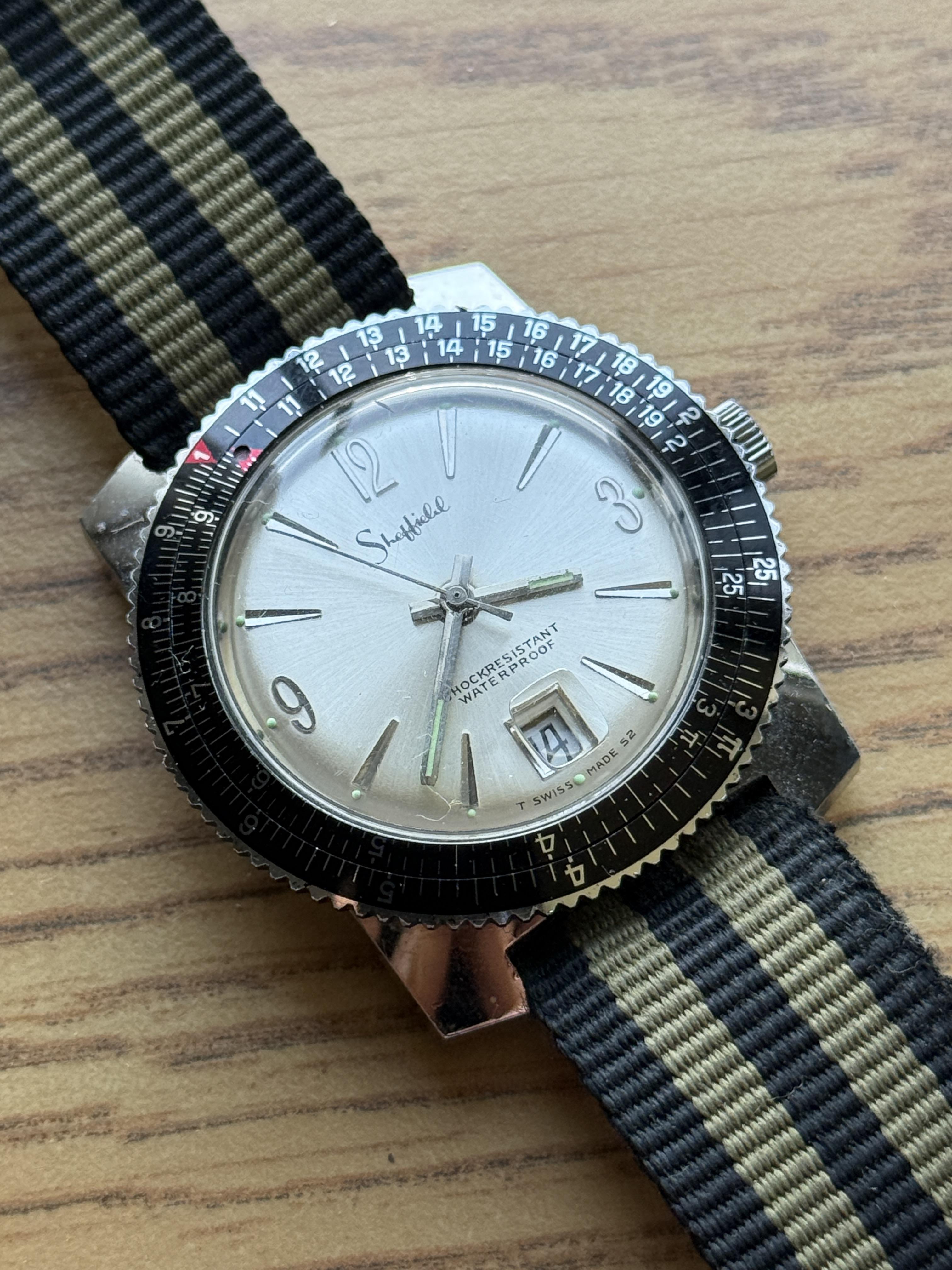 Up for sale is this very cool Sheffield Slide Rule Flight Watch. This watch keeps great time and is in awesome condition. A very special watch, Sheffield was well known for their All Sport line of dive watches. Both the inner bezel and outer bezel turn with no issues. Date turns over, dial has a beautiful sunshine texture, and crystal is in great condition. Asking $200 SHIPPED through Paypal FF or Zelle. Shipping from Northeast USA to CONUS only.