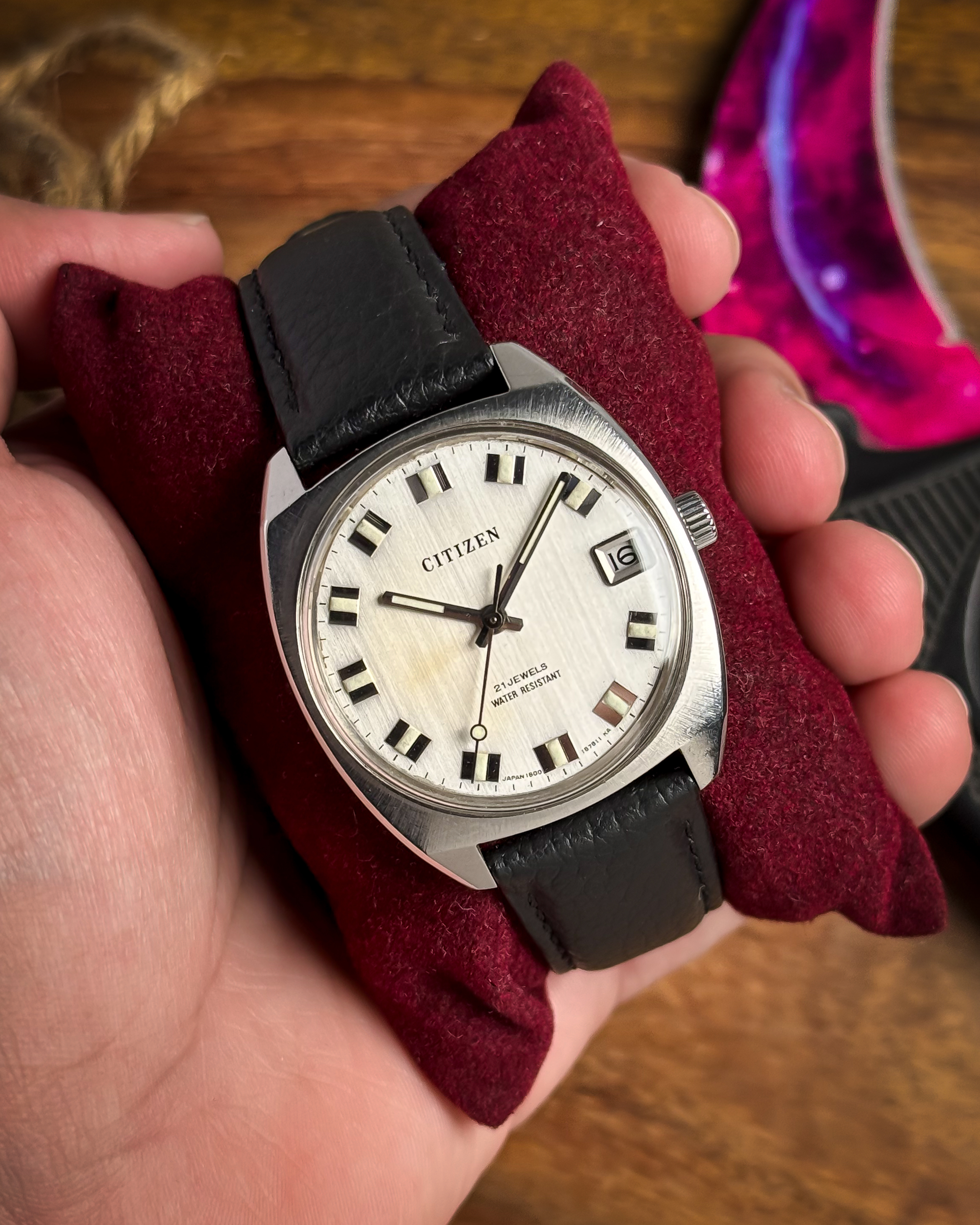 [Timestamp](https://drive.google.com/file/d/1JmK2fKkINTq_NkAUfALvPymEm4n_ISUa/view?usp=sharing) Thisย **1970s Citizen Para Water**ย is a fantastic study in vintage geometry, beginning with its captivatingย **Silver Linen Dial**. Over the decades, the linen texture has developed a warm,ย **tropical patina**ย that looks incredible under theย **acrylic crystal**. The face is detailed withย **faceted silver baton indices**ย featuring central lume strips, complemented byย **lume pencil hands**and a uniqu...