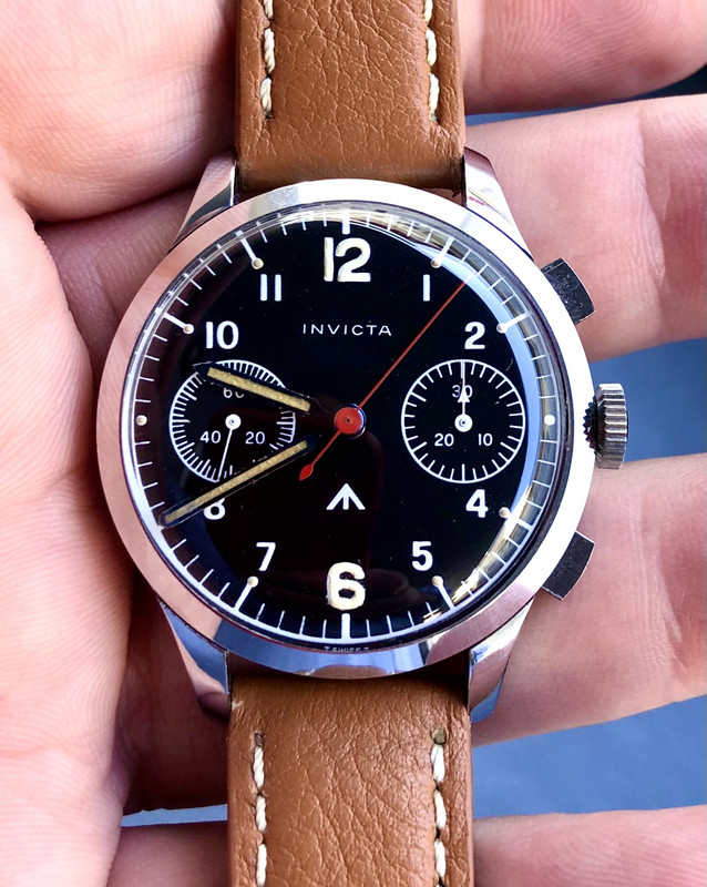 For sale: A very rare, (possibly prototype) vintage Invicta chronograph circa 40's or 50's. This Invicta chronograph with a broad arrow dial and blue-steeled hands, is housed in a period correct case that contains an Invicta marked, pristine Valjoux 22 movement. Watch winds and runs beautifully. 37mm 18mm lug width, chrome case with stainless steel back. Very clean, New Old Stock condition. Looks like lume has been added to the 12 & 6 markers, all else appears original. Asking: $1,150 shi