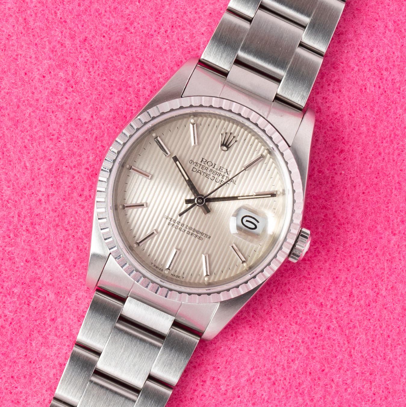 1988 Rolex Datejust 16220 Silver Tapestry Dial $4,950 Unique vertical silver tapestry dial and hand set on this later reference 16220 with steel engine turned bezel on oyster bracelet. The engine turned bezel and oyster bracelet combo makes a great companion whether dressed up, or down. The watch appears to have been recently polished, showing no signs of wear since. The oyster bracelet is in great condition, with no slack. Serial - Year: L2 serial ~1988 Bracelet - Strap: 78360 bracelet with...
