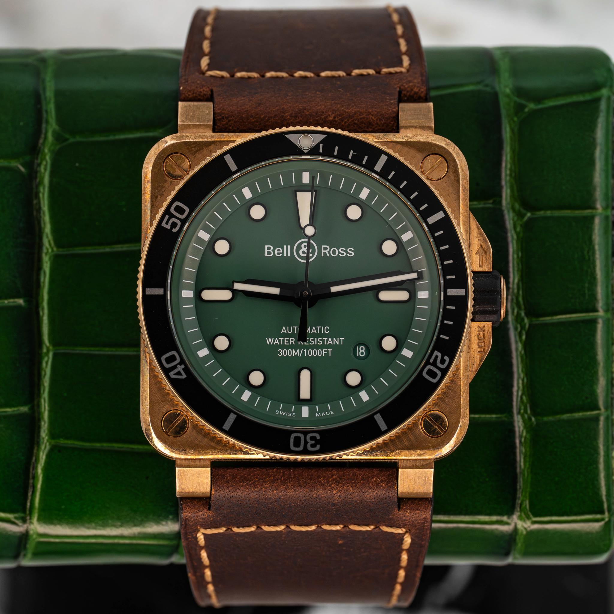 2025 Bell and Ross BR 03-92 Diver Bronze Green Dial w Brown & Black Strap B+P Price: 3,600 The Bell & Ross BR0392-D-LT-BR/SRB Bronze Diver has that signature Bell & Ross square case with a bold, legible dial. The watch was made in a limited run of just 999 pieces. It’s built like a proper dive watch with a bronze case and a reliable automatic movement, while still keeping a unique, modern look that stands out from the usual round cases. With a stunning green dial and brown leather str...