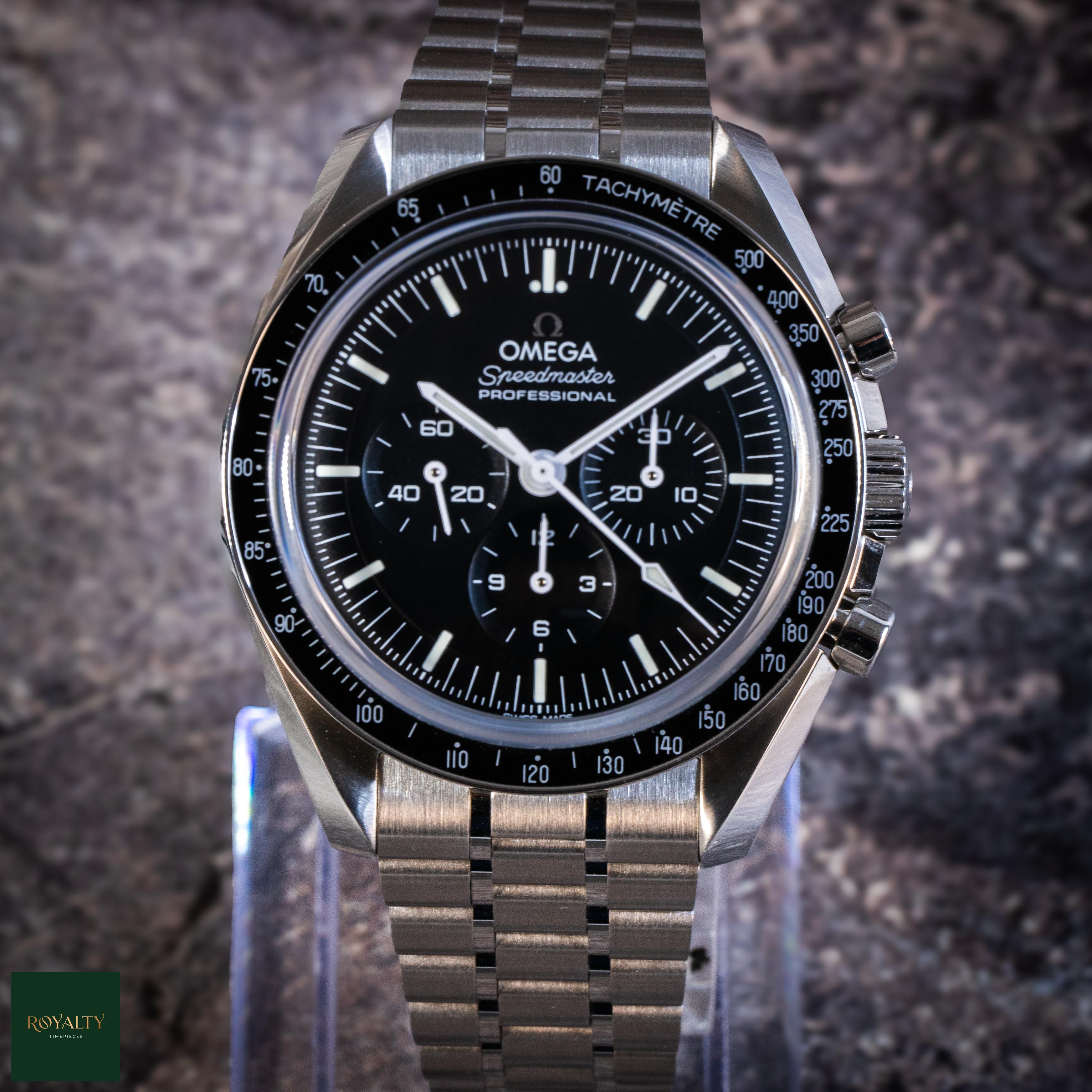 Omega Speedmaster Moonwatch Professional Sapphire 310.30.42.50.01.002 Case: 42mm ------------------------------------------------- Condition & Scope: Transparency is paramount at Royalty Timepieces. This timepiece is in Good Pre-owned Condition. Condition: This timepiece is in excellent condition and comes partially stickered, showing minimal signs of handling or wear. Included: Complete collectors set (dated 2022). Strap/Bracelet: Original Omega stainless steel bracelet with polished mid-...