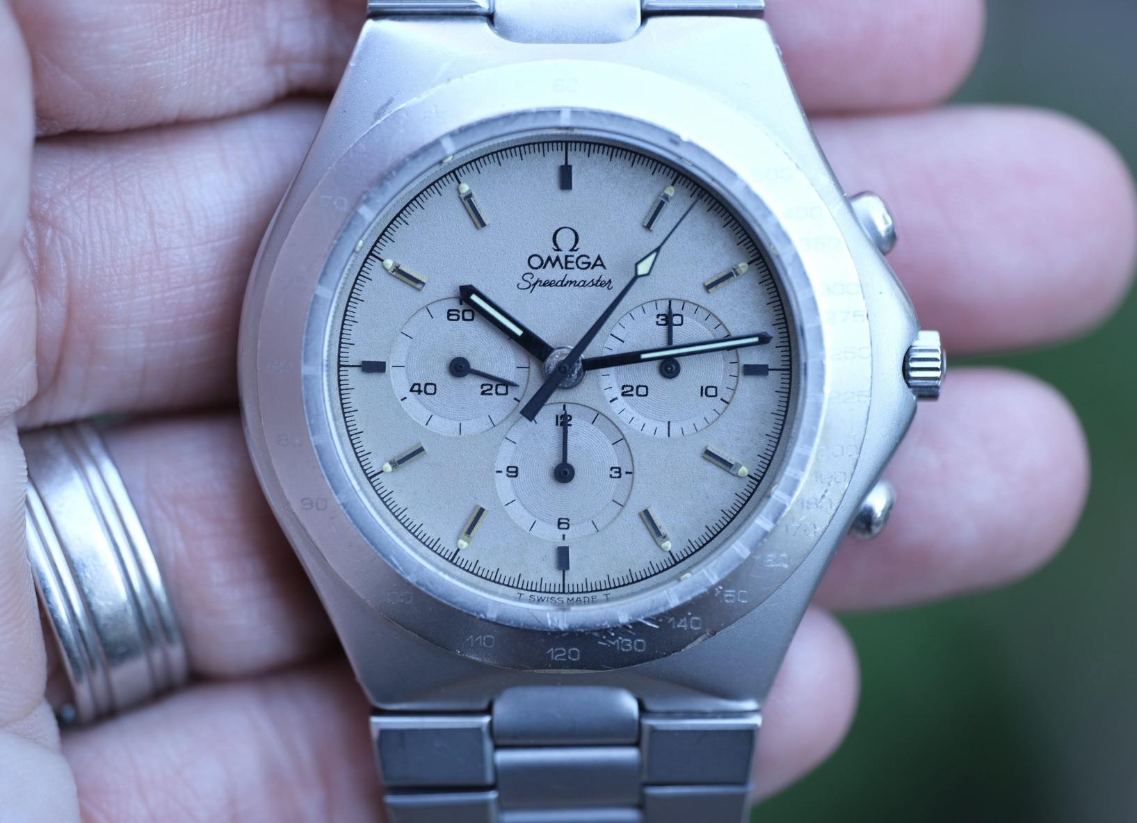Not your run-of-the-mill Speedy. Made for just a few years in the early 1980s, and specifically for the German market, the Omega Speedmaster Teutonic ref 145.0040 was a pretty crazy design swing, looking more like something out of Blade Runner than the race track. With its bead-blasted case and integrated bracelet, it’s a full sized Speedmaster you’re unlikely to see on anyone else’s wrist, AND at half the price of its brethren! FULL PICS: https://imgur.com/a/zI10iNC DIAL: More often seen with...