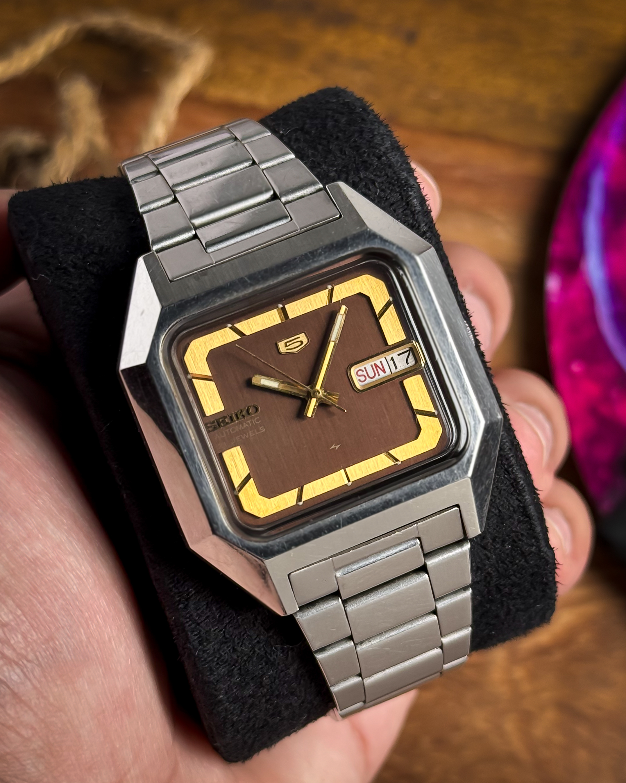 [Timestamp](https://drive.google.com/file/d/1qP_oOz-zgPfq2CELW2mwmv_QDdpw-mMw/view?usp=sharing) Thisย **July 1979 Seiko 5**ย is a beautifully preserved example of the iconic "TV Dial" era. The centerpiece is the deepย **Chocolate Brown Dial**, which features a subtleย **Linen Texture**ย that adds incredible depth. This is surrounded by a vibrantย **yellow boundary track**, specifically designed with cut-out spaces that reveal the indices. The branding is uniquely balanced, featuring theย **"5" log...