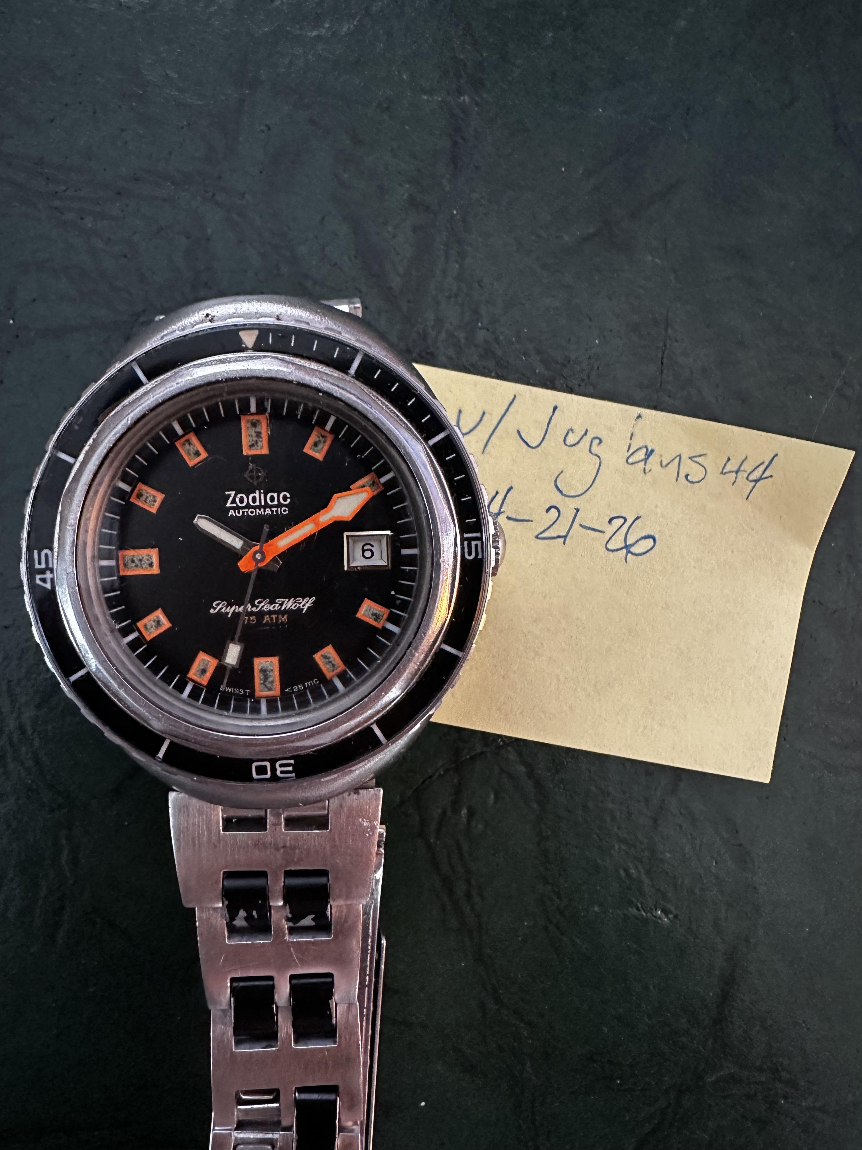 \[WTS\] Killer 1970s Zodiac Super Sea Wolf 75 ATM. Recent service complete service. Phenomenal dial, hands, and lume. Reference: 1796 Cal. 72B, auto, date, 21 jewels Case: 43mm x 50mm x 15mm Screw-down crown Original JB Champion Zodiac bracelet fits 7-1/2" Half of a ling missing. Easily fabricated. Price: $1,995 shipped CONUS. Payment via Zelle, Wire, Venmo, PayPal