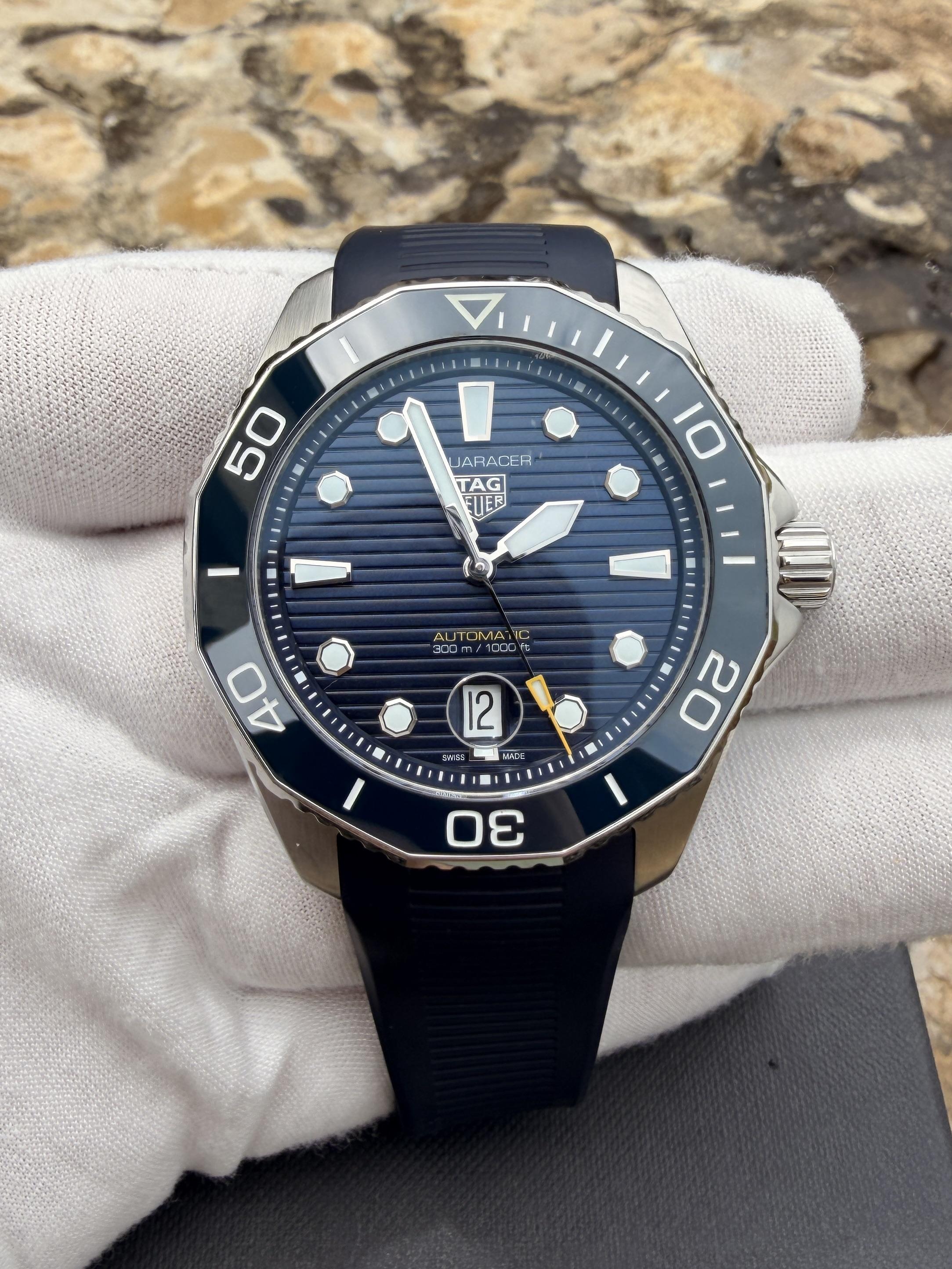 2024 43mm Tag Aquaracer in blue full set (double box, warranty card). Runs and functions perfectly. Awesome micro adjust. Worn 3-4 days per month. Very light surface scratches. Tiny AR coating scratch near 1 o’clock marker on crystal. Condition excellent, see pics. Strap cut for 7.5 wrist $1995 shippped & insured CONUS