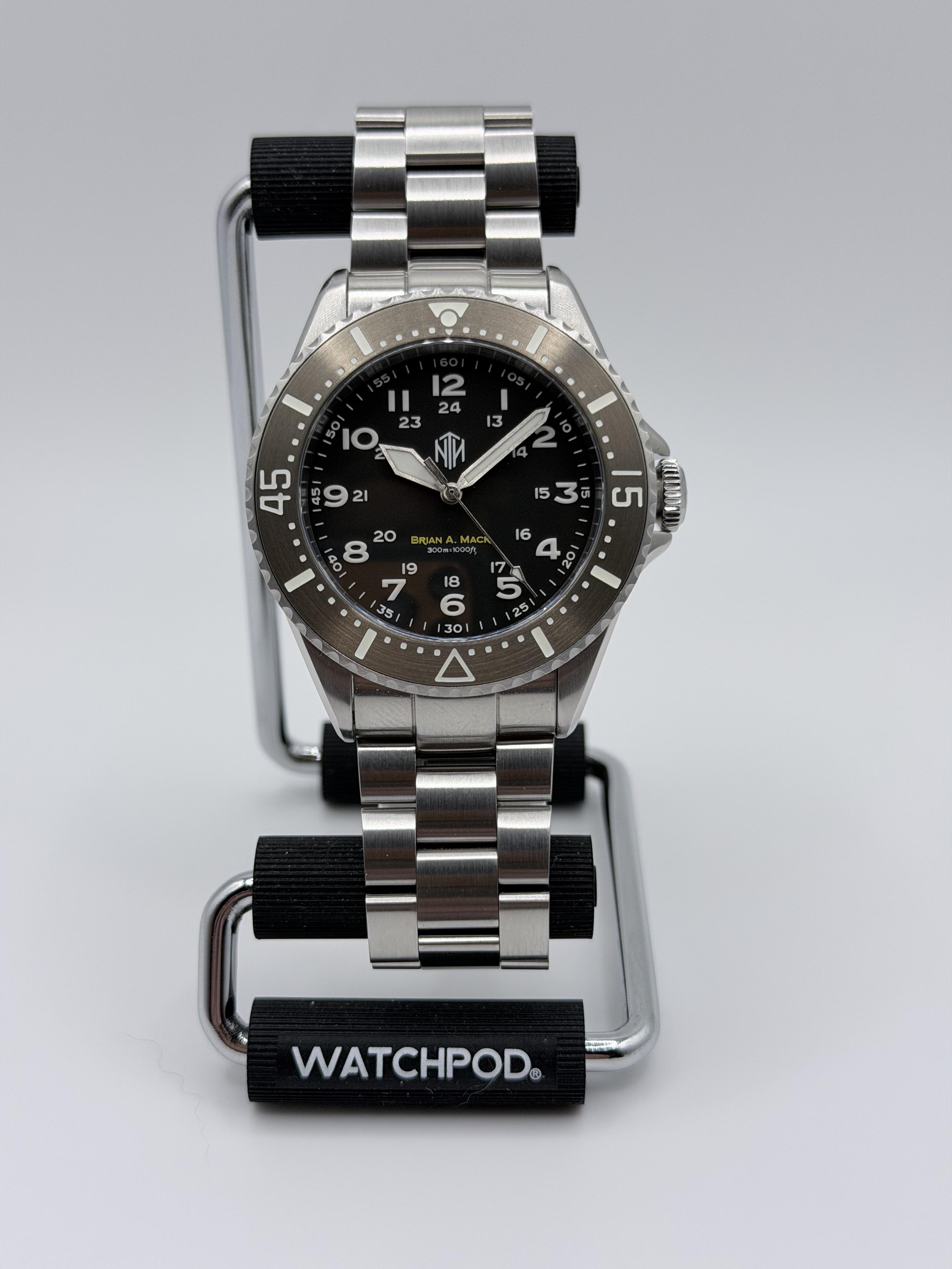 Hello all. Up for sale is the rare NTH Mack Diver. Honorably made for founder Chris Vail’s friend and colleague Brian Mack, Army Ranger KIA Jan. 2005. RIP Mack. Like new with no marks, full kit, full links and also includes an extra oyster bracelet, a BoR bracelet, and a rubber strap too. Very cool dual time bezel for count up or down, depending on which triangle you orient the minute hand to. Tidy 40x48x11.5mm. Miyota no ghost date 90S5. What else I like is that on the dial there are three num...
