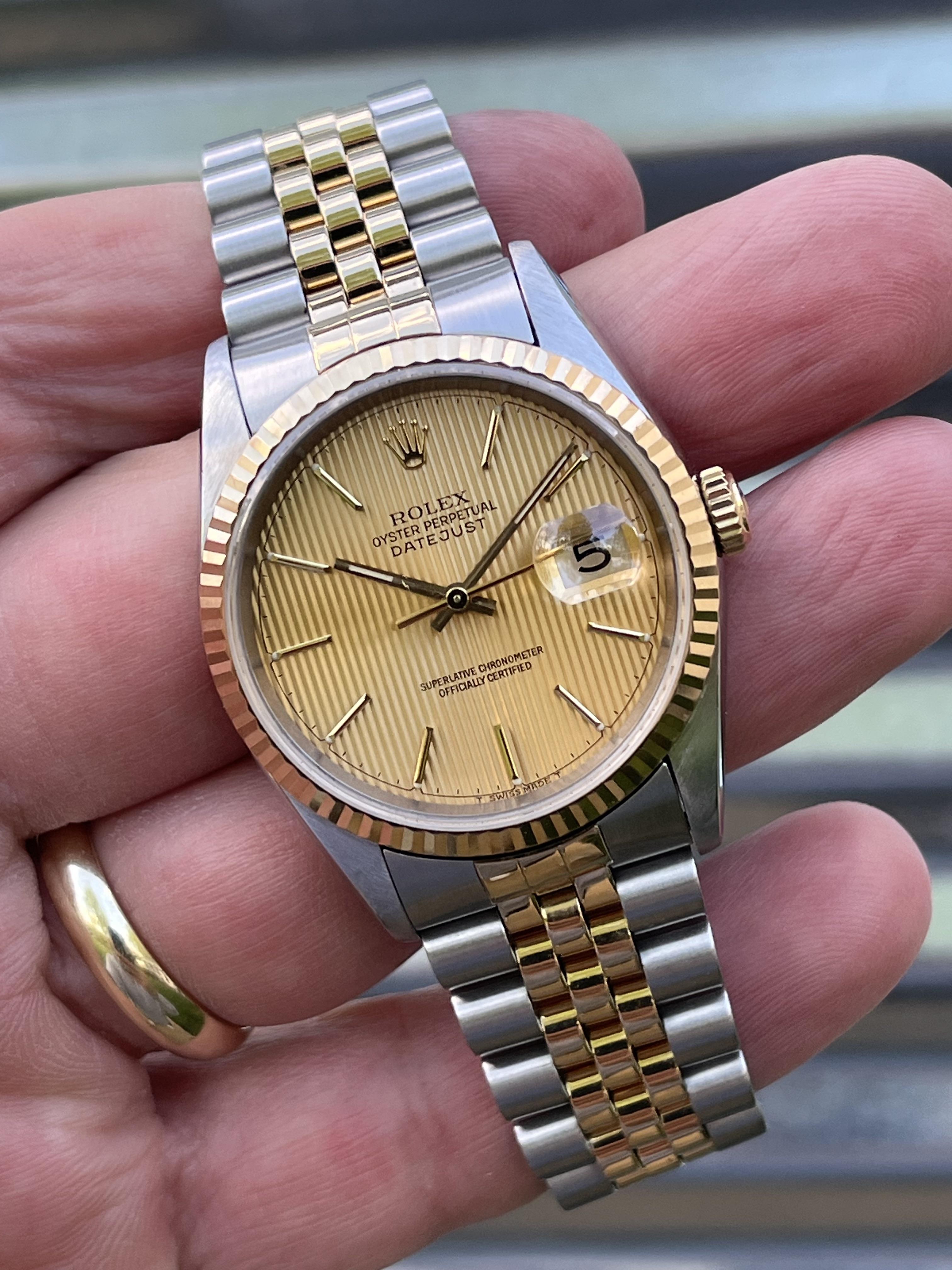 Here is a clean example of a classic Rolex Datejust 36, reference 16233. It features an 18k gold fluted bezel, jubilee bracelet, paired with a champagne tapestry dial made famous in the movie American Psycho. This particular example is from 1996 Reference number: 16233 Serial number: T48****** serial which dates this watch to 1996 COMES with BOX & PAPERS (see second picture for everything that’s included) 💰7️⃣5️⃣0️⃣0️⃣+✈️ The watch is in overall excellent condition- see pics for details. ...
