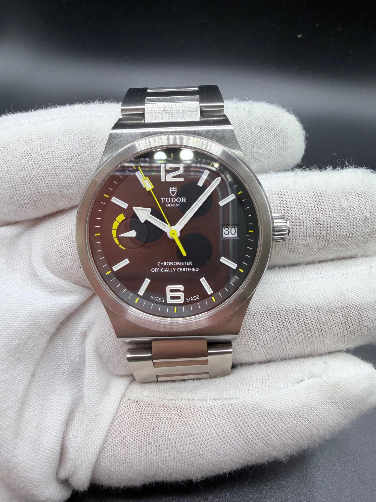 **F/S: Tudor North Flag Ref# 91210N** **Shipping from Florida** **Specs:** \* Beautiful matte black dial w/yellow second hand and power gauge \* Automatic self-winding \* 40mm \* 3 link steel Bracelet \* 100M Water Resistance \* 70-hour power reserve \* MT5621 COSC movement **Includes**: Watch only **Condition:** Excellent pre-owned condition, very few hairlines. One mark on side of the case, see pic. **Bracelet has 8 ½ total links**. Will fit a 7in wrist. Pictures are an accurate ...