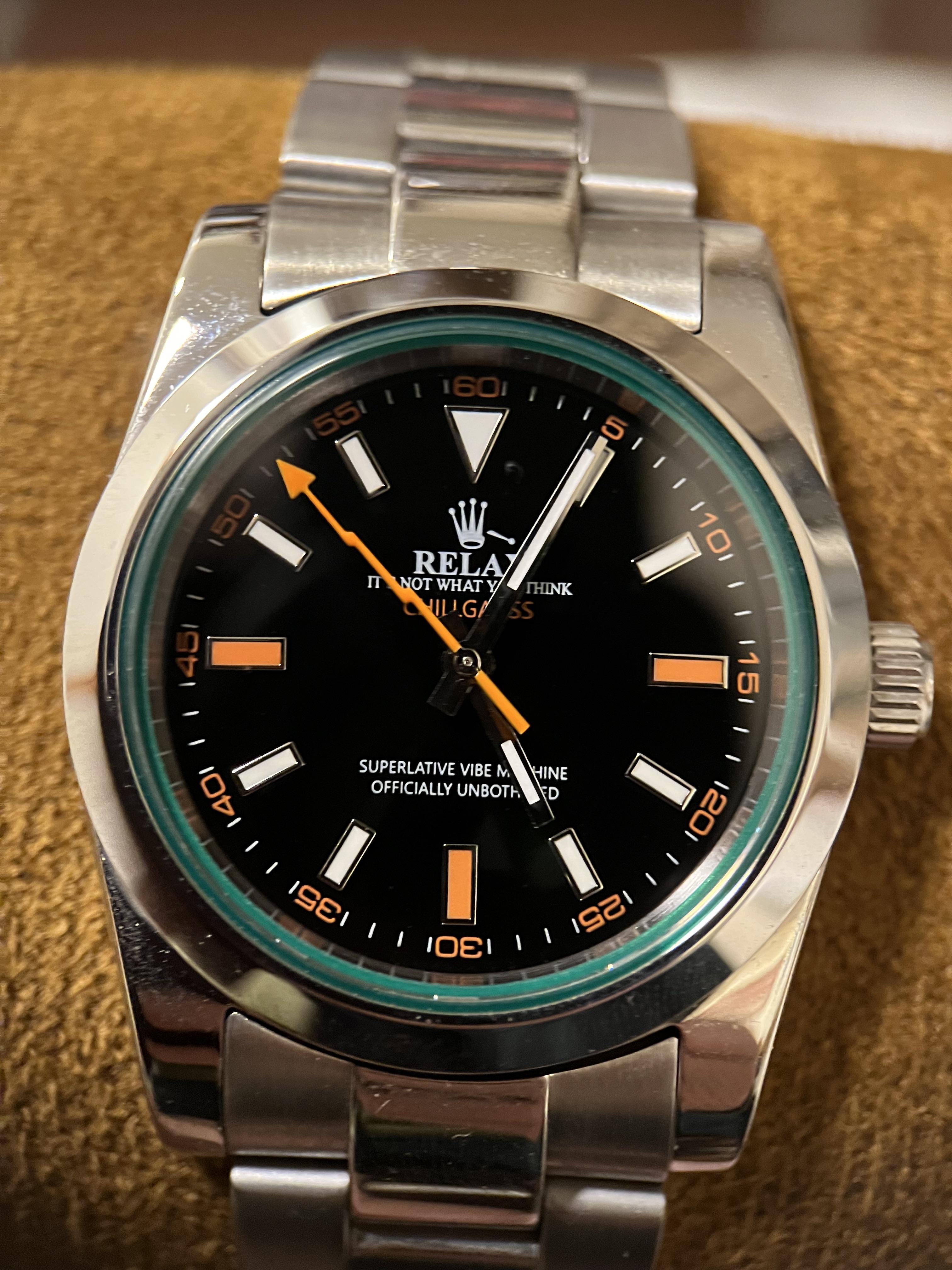 Hello WatchEx I am putting sale my Relax Chillgauss 37mm. I got this here from another seller. It has been a box queen since day one. It is a funny take to Rolex Milgauss which is my favorite Rolex. I want to empty my box hence the sale. Asking $240 plus CONUS shipping. Prefer Zelle or PayPal F&F. It has Seiko NH-35 movement and working as it should. Just the watch. I didn’t come with box or anything.