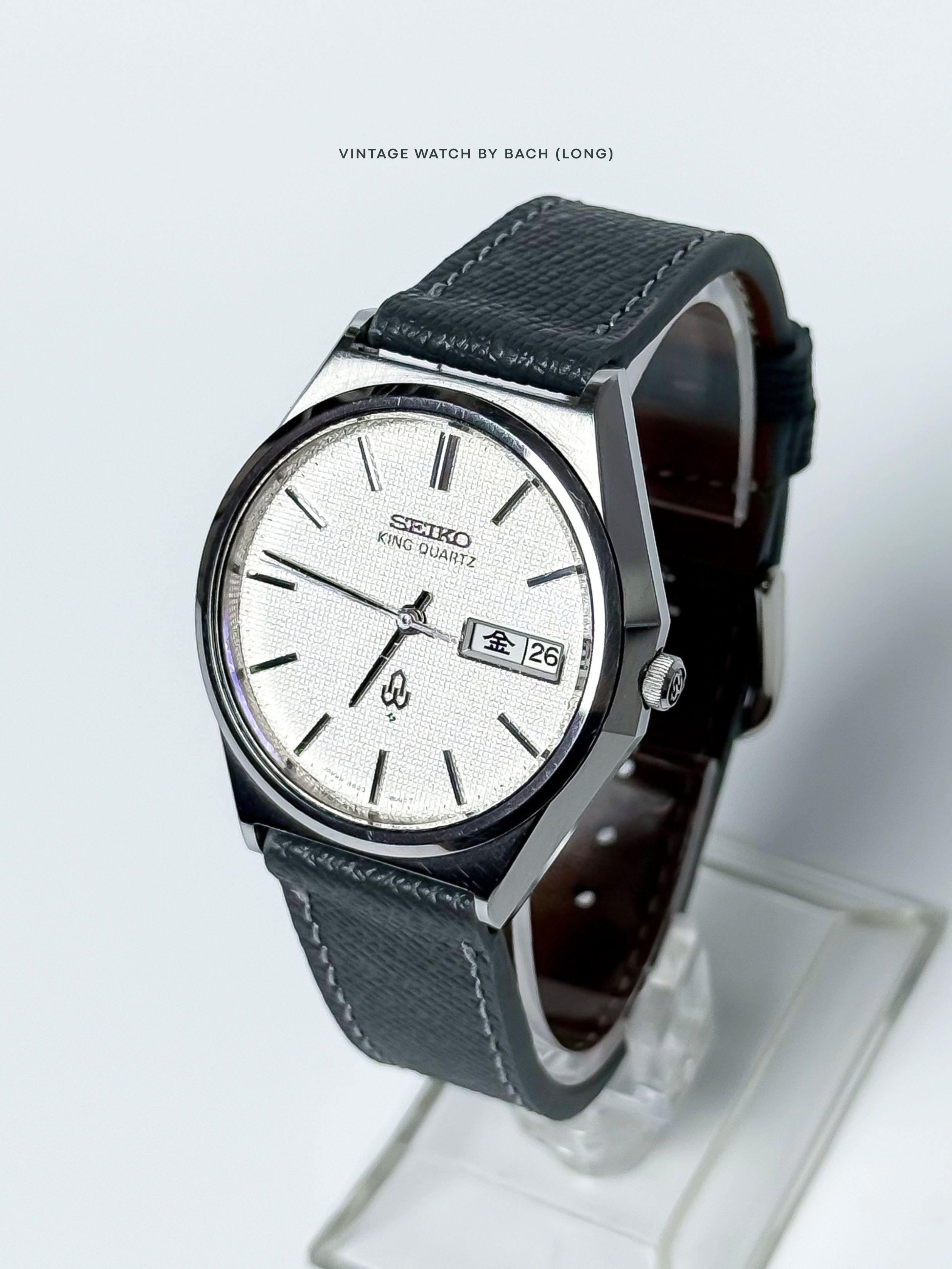 Seiko King Quartz 4823-8050 White Checkered Pattern Dial - Price includes shipping + import duties + taxes (DDP) SPECIFICATIONS: \- Japanese Seiko King Quartz good condition from May 1976, classic and vintage style. \- King Quartz was an high-end quartz watch brand of Seiko, same tier as King Seiko at the time. Seiko caliber 4823 is a high grade analog quartz watch movement, high precision ±10 seconds/month. \- New handmade leather band. Fit up to 18.5cm wrist. \- Stainless steel ca...