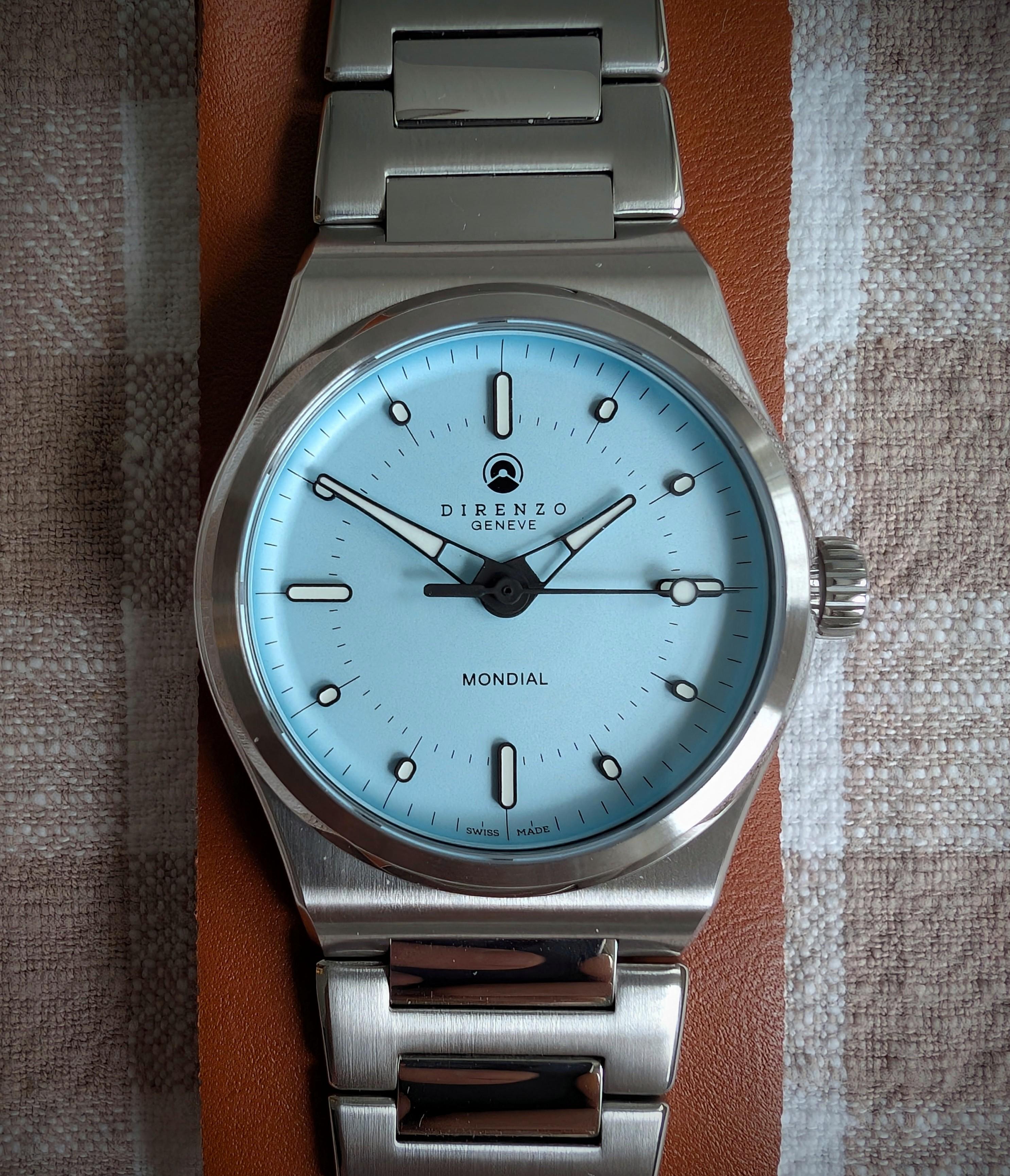 Hello everyone! Up for sale is the recently released 38mm DRZ 04R Mondial in light blue. I sized it for my 6.7" wrist. This is a complete kit with box, extra links and warranty card. In addition, it will also come with the new black rubber strap. very light scuffs on a couple of links on the underside of the watch (see gallery). They are not noticeable without scrutiny and can be easily swapped with the extra links in the pouch. Please, let me know if you have any questions. [timestamp](https...