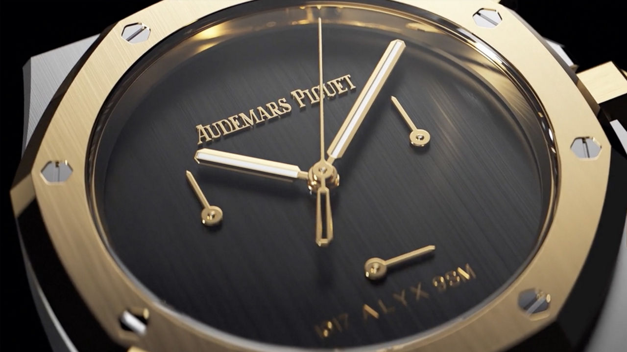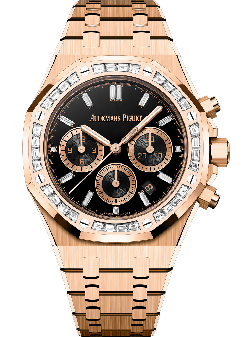 This 18-carat pink gold timepiece is set with 436 baguette-cut diamonds, illuminating the cutting-edge openworked double balance wheel mechanism in rhodium-toned hue visible on both sides of the watch. 18-carat pink gold case and bezel set with baguette-cut diamonds, glareproofed sapphire crystal and caseback. Openworked rhodium-toned dial, pink gold-toned baguette-cut sapphires hour-markers and Royal Oak hands with luminescent coating.