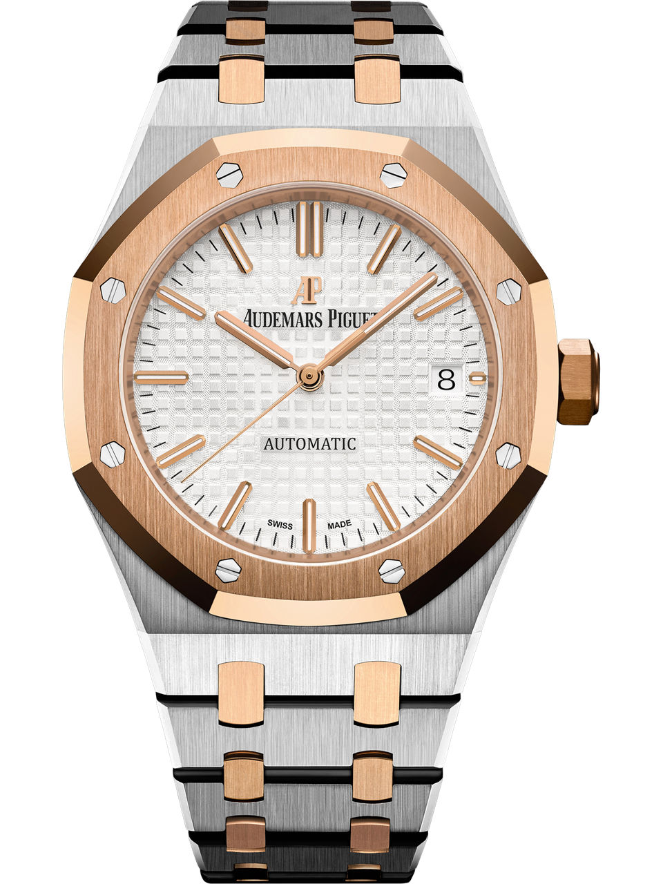 The slender, architectural form of the Royal Oak is outlined in a 37 mm case size and a two-tone material mix: steel and 18-carat pink gold. A pink gold-toned “Grande Tapisserie” dial beautifully underlines the design of this horological icon. Stainless steel case, glareproofed sapphire crystal and caseback, 18-carat pink gold bezel, screw-locked crown and links, water-resistant to 50 m. Silver-toned dial with “Grande Tapisserie” pattern, pink gold applied hour-markers and Royal Oak hands with luminescent coating.