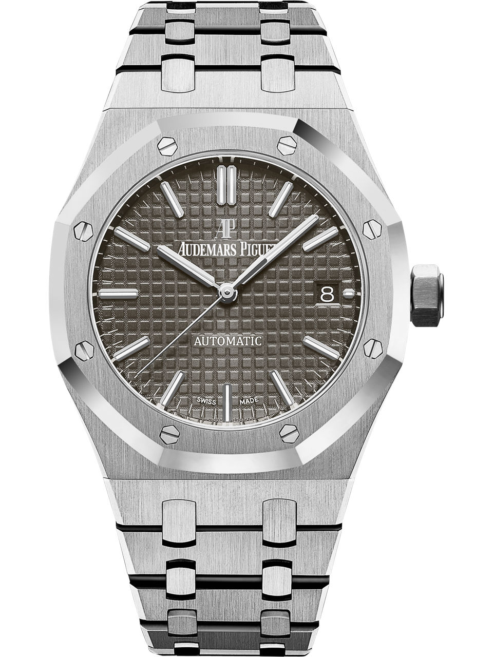 The primacy of craftsmanship in polished stainless steel, with grey ruthenium-toned dial in “Grande Tapisserie” motif. Stainless steel case, glareproofed sapphire crystal and caseback. Ruthenium-toned dial with “Grande Tapisserie” pattern, white gold applied hour-markers and Royal Oak hands with luminescent coating.