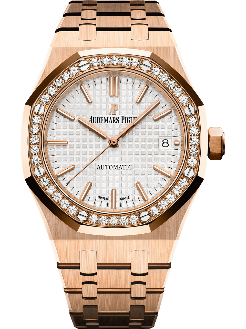 Selfwinding watch with date display and centre seconds. 18-carat pink gold case, silvered dial, 18-carat pink gold bracelet. 40 brilliant-cut diamonds; ~0.90 carat (bezel). 18-carat pink gold case with diamond-set bezel, glareproofed sapphire crystal and caseback, screw-locked crown Silver-toned dial with “Grande Tapisserie” pattern, pink gold applied hour-markers and Royal Oak hands with luminescent coating