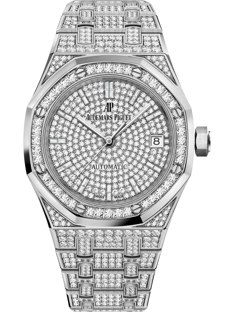 High glamour meets Haute Horlogerie. Over a thousand brilliant-cut diamonds set in the 18-carat white gold dial, case and bracelet, with 25 baguette-cut diamonds for the hour-markers. Diamond-set 18-carat white gold case, glareproofed sapphire crystal and caseback, screw-locked crown. Diamond-set 18-carat white gold dial, baguette-cut diamond hour-markers, white gold Royal Oak hands with luminescent coating.