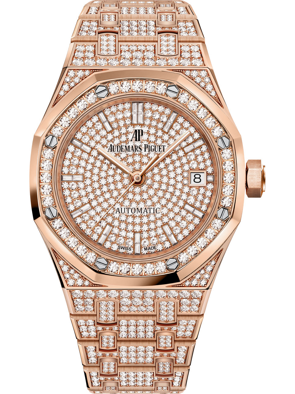 High glamour meets Haute Horlogerie. Over a thousand brilliant-cut diamonds set in the 18-carat pink gold dial, case and bracelet, with 25 baguette-cut diamonds for the hour-markers. Diamond-set 18-carat pink gold case, glareproofed sapphire crystal and caseback, screw-locked crown. Diamond-set 18-carat pink gold dial, baguette-cut diamond hour-markers, pink gold Royal Oak hands with luminescent coating.