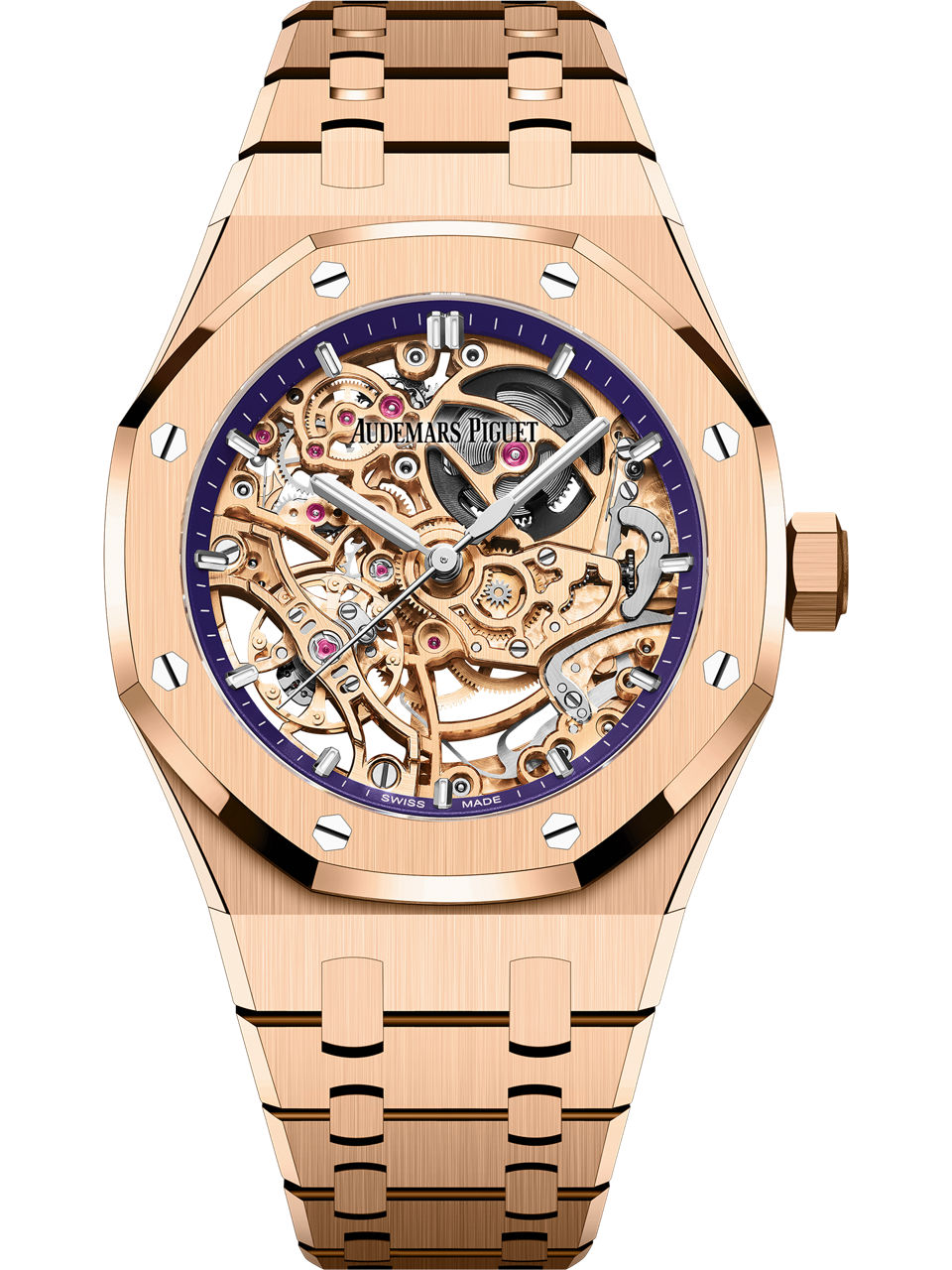 This 37 mm timepiece combines an 18-carat pink gold case and bracelet with a matching pink-gold-toned openworked movement, revealing the double balance wheel mechanism on either side of the watch. The purple inner bezel adds a touch of colour. 18-carat pink gold case, glareproofed sapphire crystal and caseback. Purple inner bezel, white gold applied hour-markers and Royal Oak hands with luminescent coating.