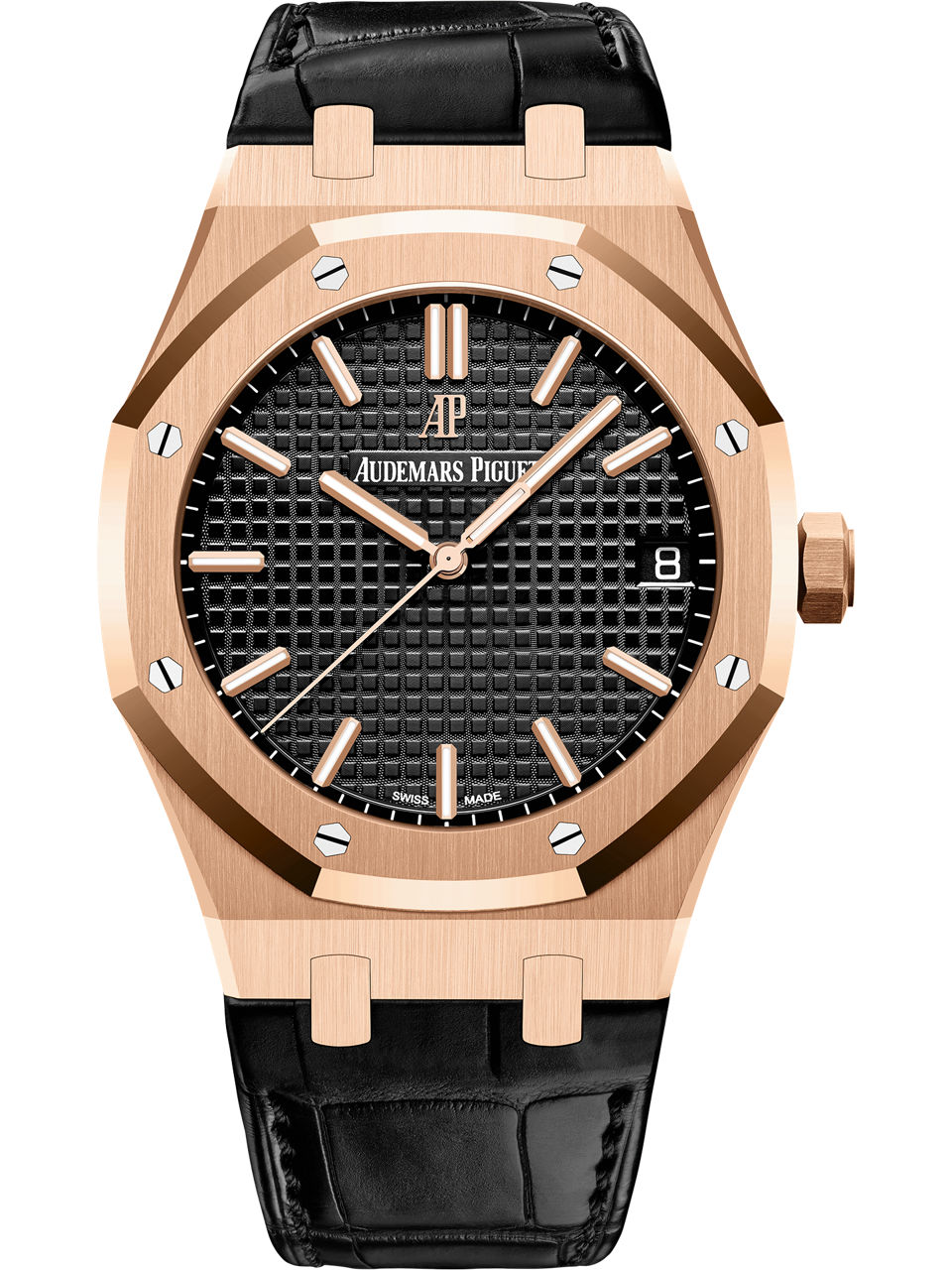 This pink gold Selfwinding Royal Oak with alligator strap offers new details: wider indexes, a minute train printed on the external area, and a date window further away from the centre. 18-carat pink gold case, glareproofed sapphire crystal and caseback, screw-locked crown. Black dial with “Grande Tapisserie” pattern, pink gold applied hour-markers and Royal Oak hands with luminescent coating.