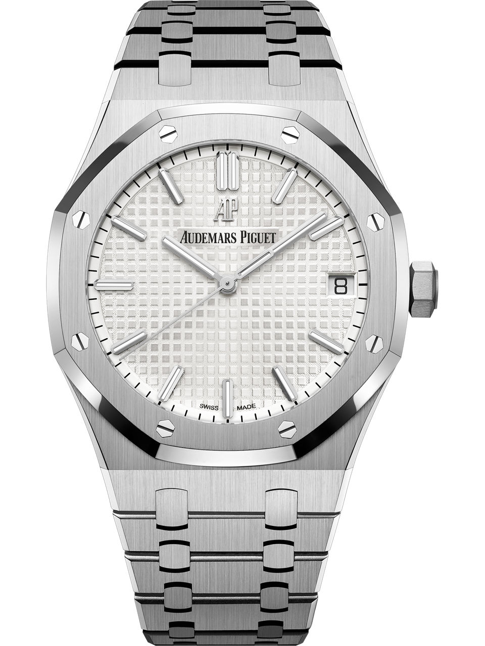 The Royal Oak’s silver-toned "Grande Tapisserie" dial enhances the stainless steel case and bracelet with a subtle play of light. Stainless steel case, glareproofed sapphire crystal and caseback, screw-locked crown. Silver-toned dial with “Grande Tapisserie” pattern, white gold applied hour-markers and Royal Oak hands with luminescent coating.