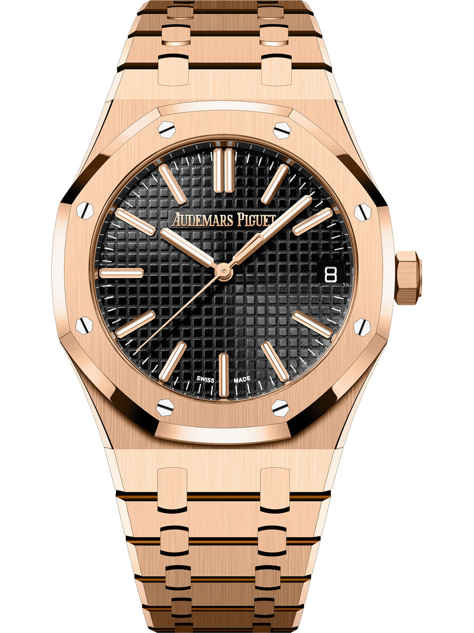 The 18-carat pink gold Royal Oak Selfwinding in 41 mm is enriched with the collection’s latest ergonomic design evolution and contrasted with a black "Grande Tapisserie" dial. 18-carat pink gold case, glareproofed sapphire crystal and caseback, screw-locked crown. Black dial with “Grande Tapisserie” pattern, pink gold applied hour-markers and Royal Oak hands with luminescent coating.