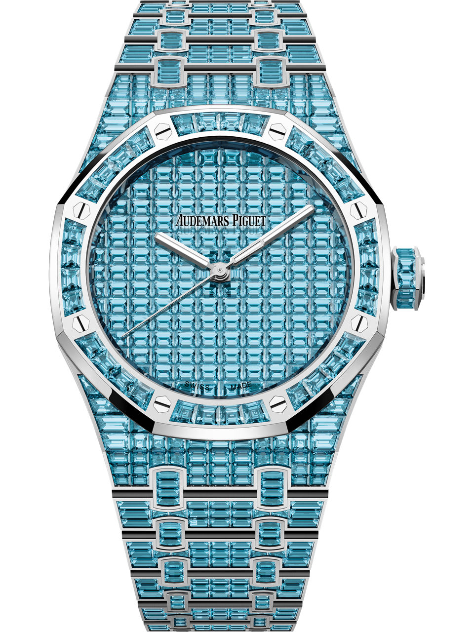 This piece is part of a set of ten pieces, each decorated with a different gemstone. This refined 41 mm Royal Oak Selfwinding displays 861 baguette-cut blue topaz (~41.3 carats) which enhance the case and bracelet's subtle design evolution. The watch also encompasses the dedicated "50-years" oscillating weight. 18-carat white gold case set with baguette-cut blue topaz, glareproofed sapphire crystal and caseback. 18-carat white gold dial set with baguette-cut blue topaz, white gold Royal Oak hands with luminescent coating.
