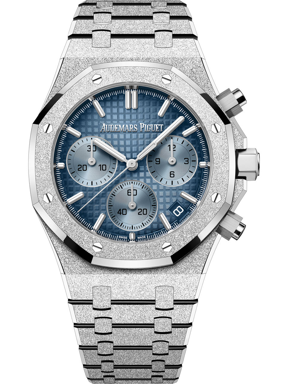 This special edition flyback chronograph combines a smoked blue dial with an elegant frosted white gold case and bracelet. Hammered 18-carat white gold case, glareproofed sapphire crystal and caseback, screw-locked crown. Smoked blue dial with “Grande Tapisserie” pattern, light blue counters, white gold applied hour-markers and Royal Oak hands with luminescent coating.