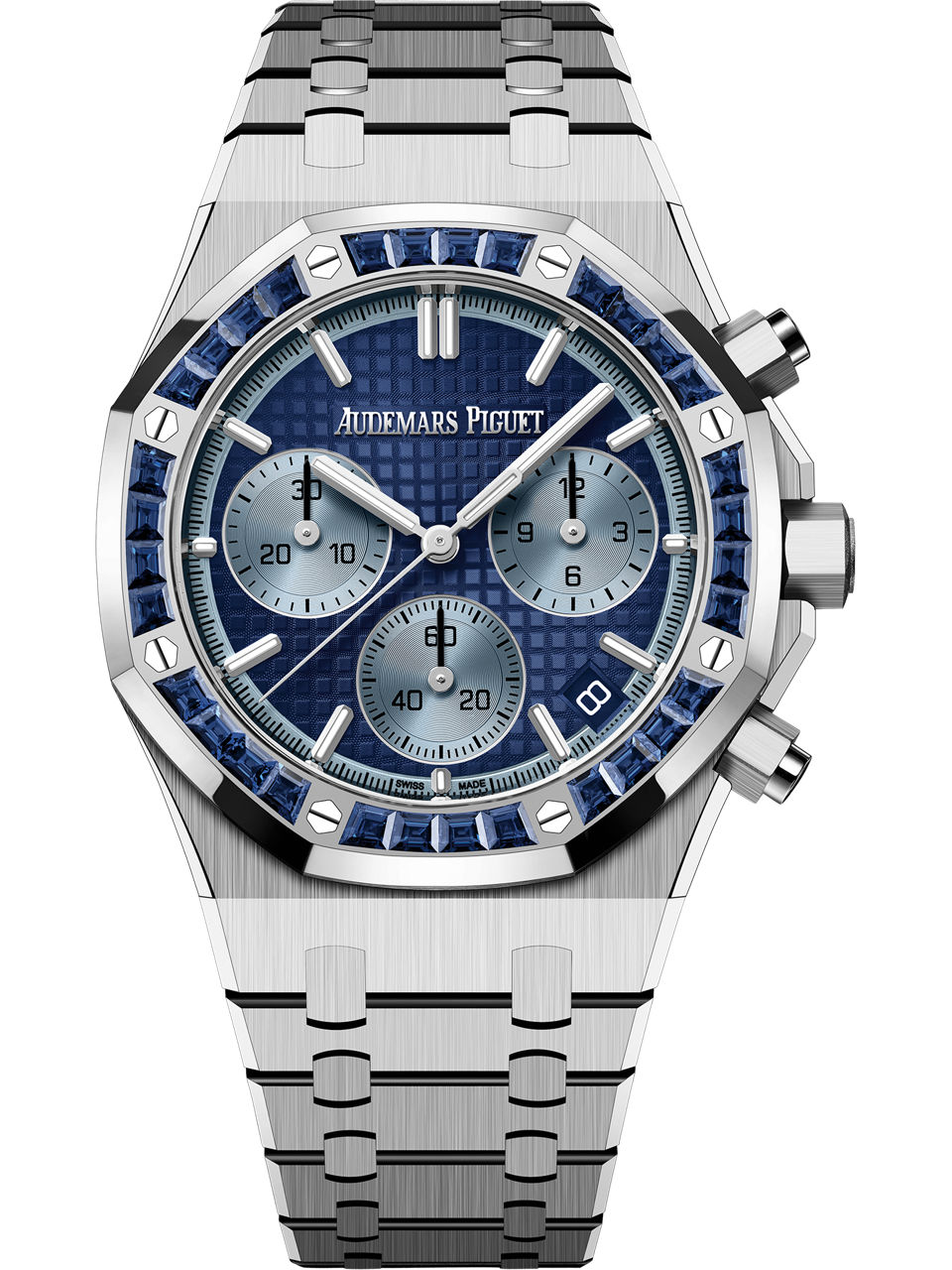 A combination of white gold and blue baguette-cut sapphires provide an elegant frame for this chronograph, adorned with a blue "Grande Tapisserie" dial and contrasting light blue counters. 18-carat white gold case, 18-carat white gold bezel set with baguette-cut sapphires, glareproofed sapphire crystal and caseback, screw-locked crown. Blue dial with “Grande Tapisserie” pattern, light blue counters, white gold applied hour-markers and Royal Oak hands with luminescent coating.