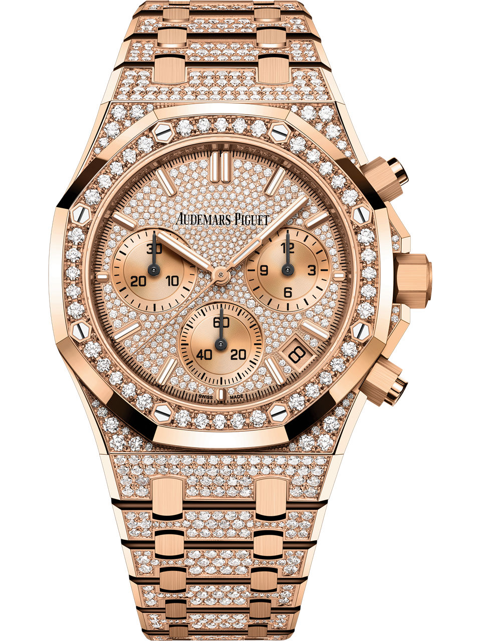 This 18-carat pink gold 41 mm chronograph is fully set with brilliant-cut diamonds. The new Royal Oak design evolution furthers the watch’s slender and elegant aesthetic. It is fitted with the “50-years” oscillating weight in 22-carat pink gold. 18-carat pink gold case set with brilliant-cut diamonds, glareproofed sapphire crystal and caseback, screw-locked crown. 18-carat pink gold dial set with brilliant-cut diamonds, pink gold-toned counters and applied hour-markers, hands with luminescent coating.