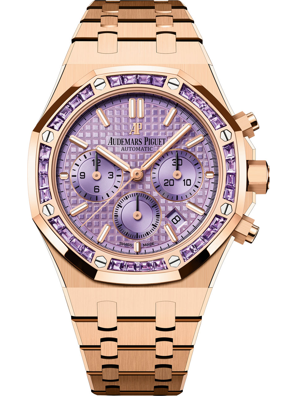 The 18-carat pink gold case and bracelet are elegantly enhanced by a bezel set with 32 baguette-cut amethysts and a dial displaying a range of purple hues that dance and change colour in the light. 18-carat pink gold case, bezel set with 32 baguette-cut amethysts, glareproofed sapphire crystal, screw-locked crown Purple dial with “Grande Tapisserie” pattern, purple chronograph counters, 18-carat pink gold applied hour-markers and Royal Oak hands with luminescent coating
