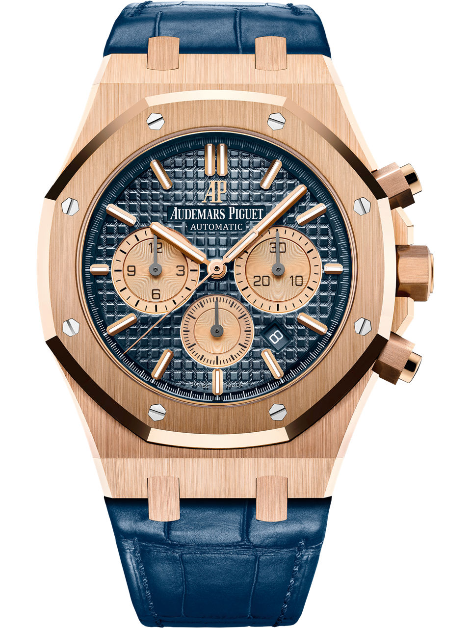 A sharp take on the two-tone dial with bigger pink gold chronograph counters and optimally designed hour markers, typeset and finishes for better readability. Pink gold case and bezel play off blue hand-stitched alligator strap and “Grande Tapisserie” dial to ruggedly dramatic effect. 18-carat pink gold case, glareproofed sapphire crystal, screw-locked crown. Blue dial with “Grande Tapisserie” pattern, pink gold-toned counters, pink gold applied hour-markers and Royal Oak hands with luminescent coating.