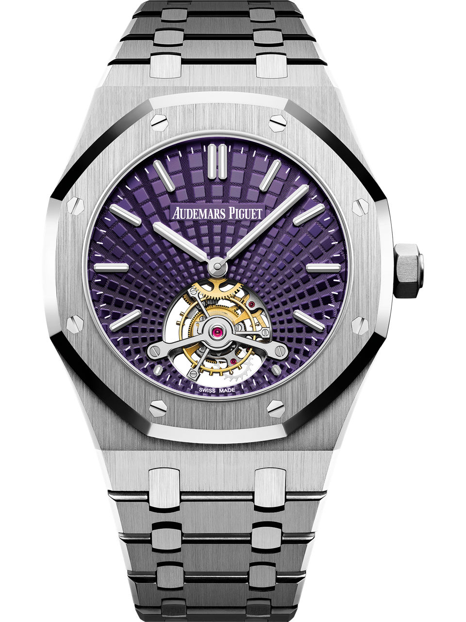 Audemars Piguet's signature “Tapisserie” design has evolved into a splendid sunburst "Evolutive" pattern. Here it is on a, new, plum-toned dial with the tourbillon taking pride of place, seen for the first time on this stainless steel watch. Stainless steel case, glareproofed sapphire crystal and caseback. Purple dial with “Tapisserie Evolutive” pattern, white gold applied hour-markers and Royal Oak hands with luminescent coating.