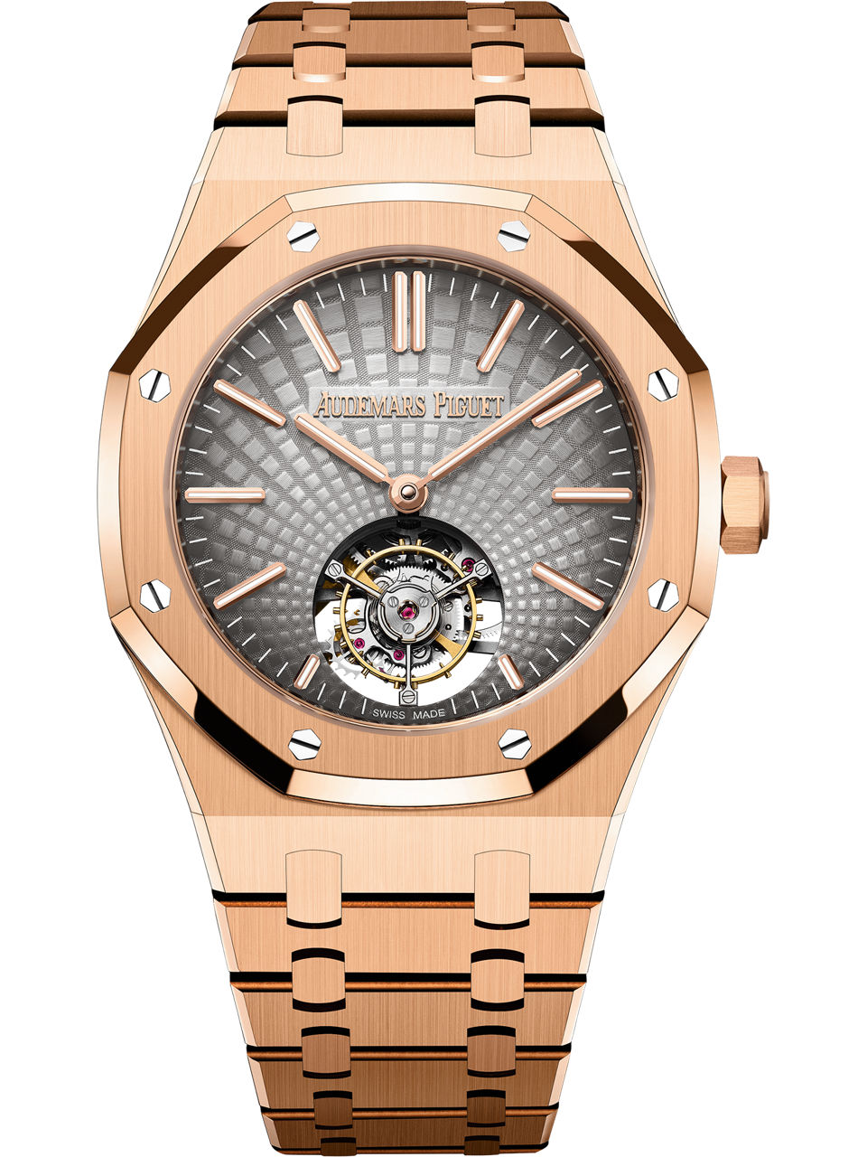 The new Selfwinding Flying Tourbillon’s smoked grey sunburst "Tapisserie" dial radiating from the flying tourbillon cage elegantly contrasts with the 18-carat pink gold case and bracelet. 18-carat pink gold case, glareproofed sapphire crystal and caseback, screw-locked crown. Smoked grey dial with “Evolutive Tapisserie” pattern, pink gold applied hour-markers and Royal Oak hands with luminescent coating.