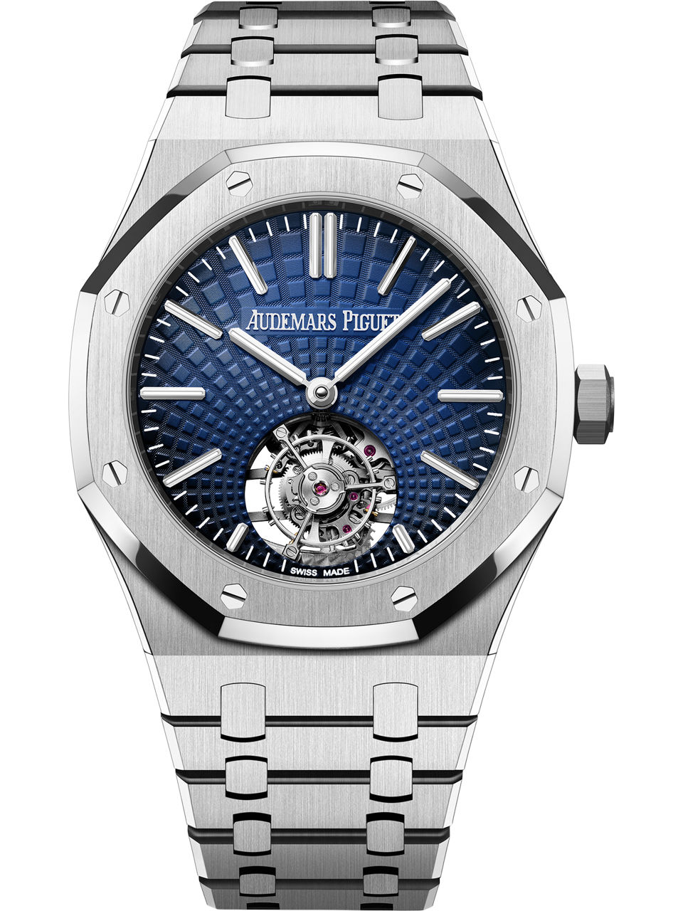 This new Selfwinding Flying Tourbillon is dressed in stainless steel and features a sunburst smoked blue "Tapisserie" dial evolving from the flying tourbillon cage at 6 o’clock. Stainless steel case, glareproofed sapphire crystal and caseback, screw-locked crown. Smoked blue dial with “Evolutive Tapisserie” pattern, white gold applied hour-markers and Royal Oak hands with luminescent coating.